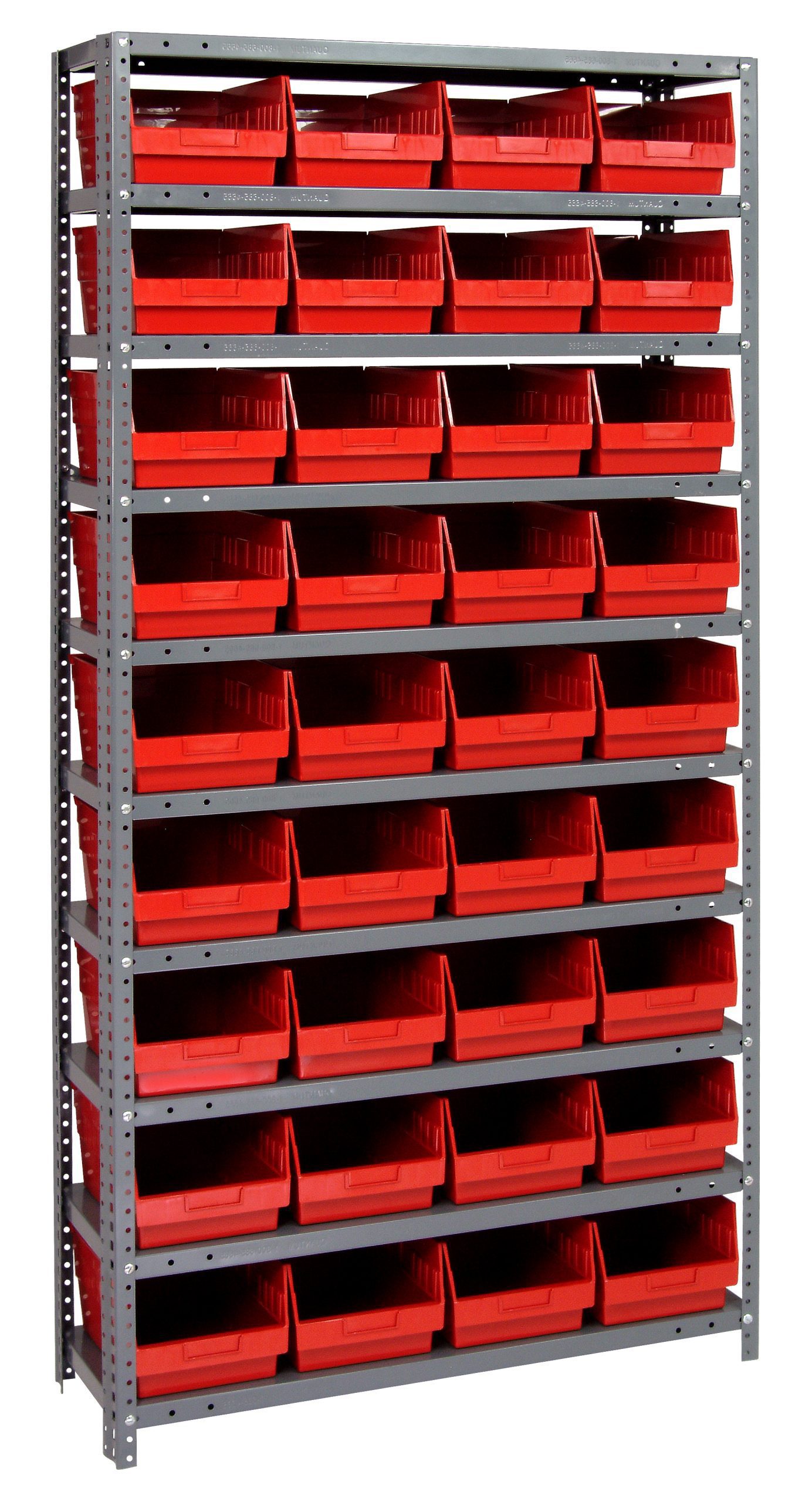 Quantum Shelving Unit, 12″D X 36″L X 75″H, Heavy Duty, 400 Lb. Load Capacity Per Shelf, Includes: (10) Shelves, (36) 11-5/8″L X 8-3/8″W X 6″H (Qsb207) Red Black Bins, Uprights And Cross Bars, Galvanized Steel Finish