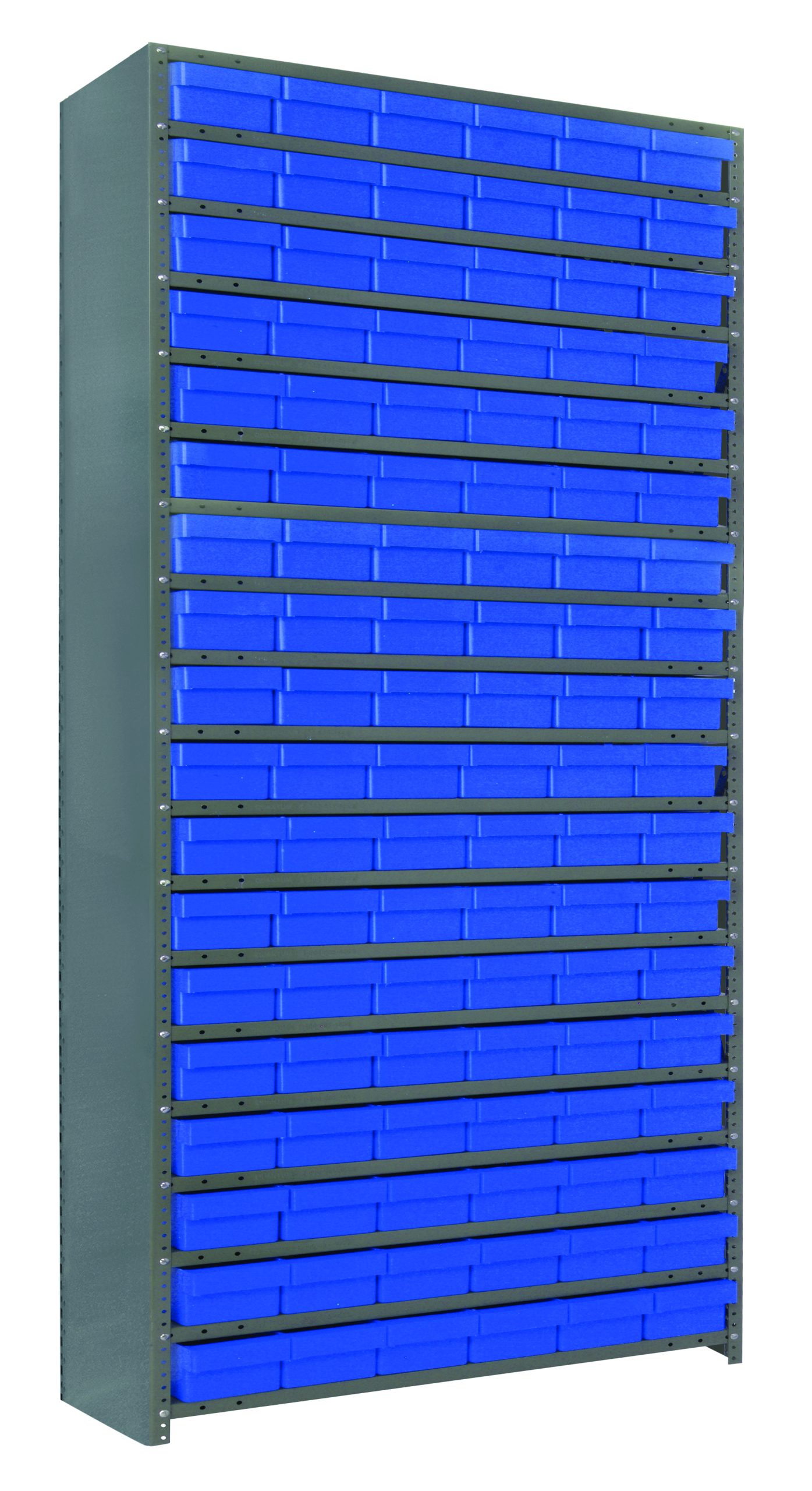 Shelving Unit, 12″D x 36″L x 75″H, heavy duty, 400 lb. load capacity per shelf, includes: (19) shelves, (27) 11-5/8″L x 5-9/16″W x 2-1/8″H (QED401) blue black bins, uprights and cross bars, galvanized steel finish
