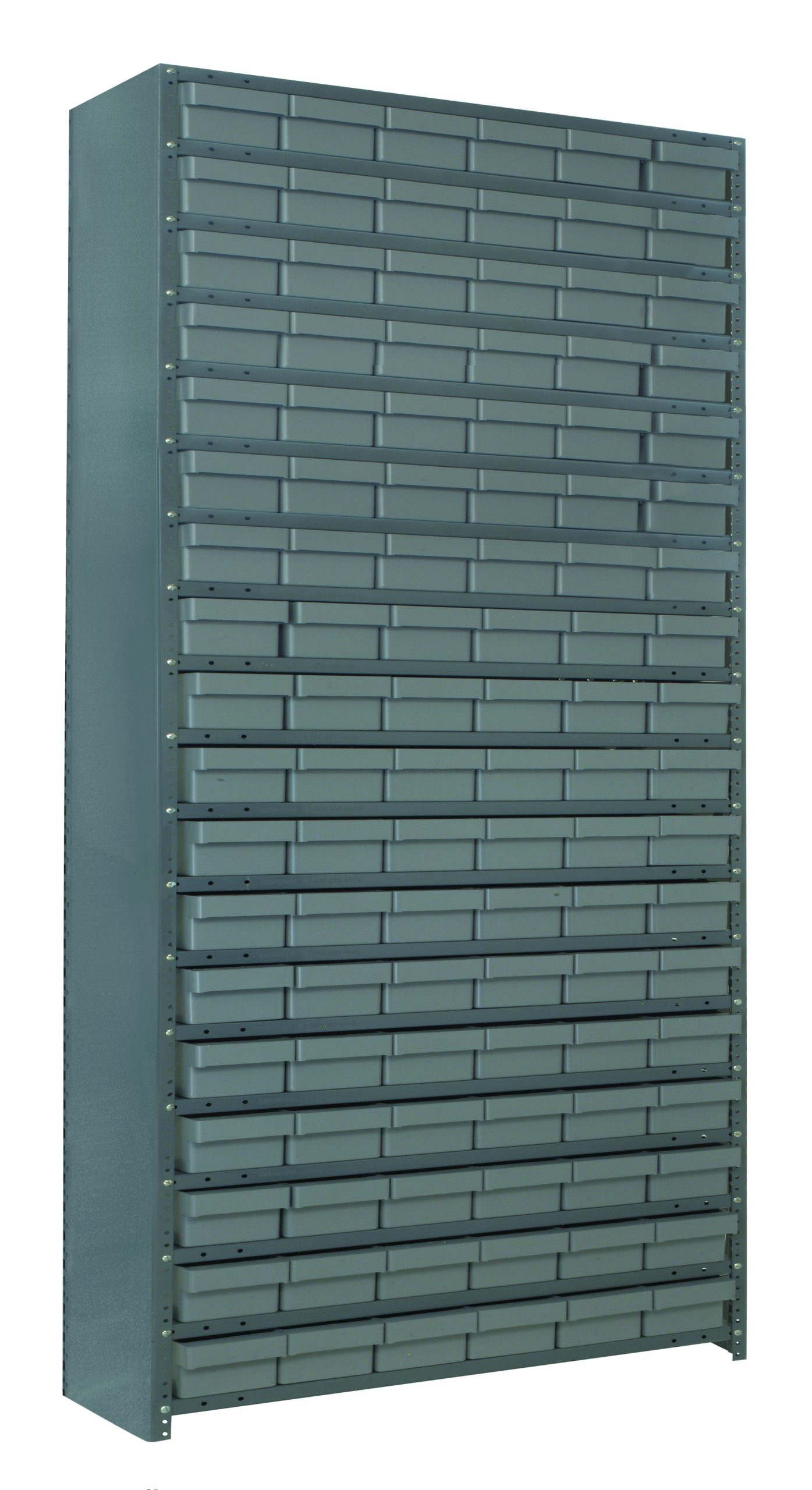 Shelving Unit, 12″D x 36″L x 75″H, heavy duty, 400 lb. load capacity per shelf, includes: (19) shelves, (27) 11-5/8″L x 5-9/16″W x 2-1/8″H (QED401) gray black bins, uprights and cross bars, galvanized steel finish