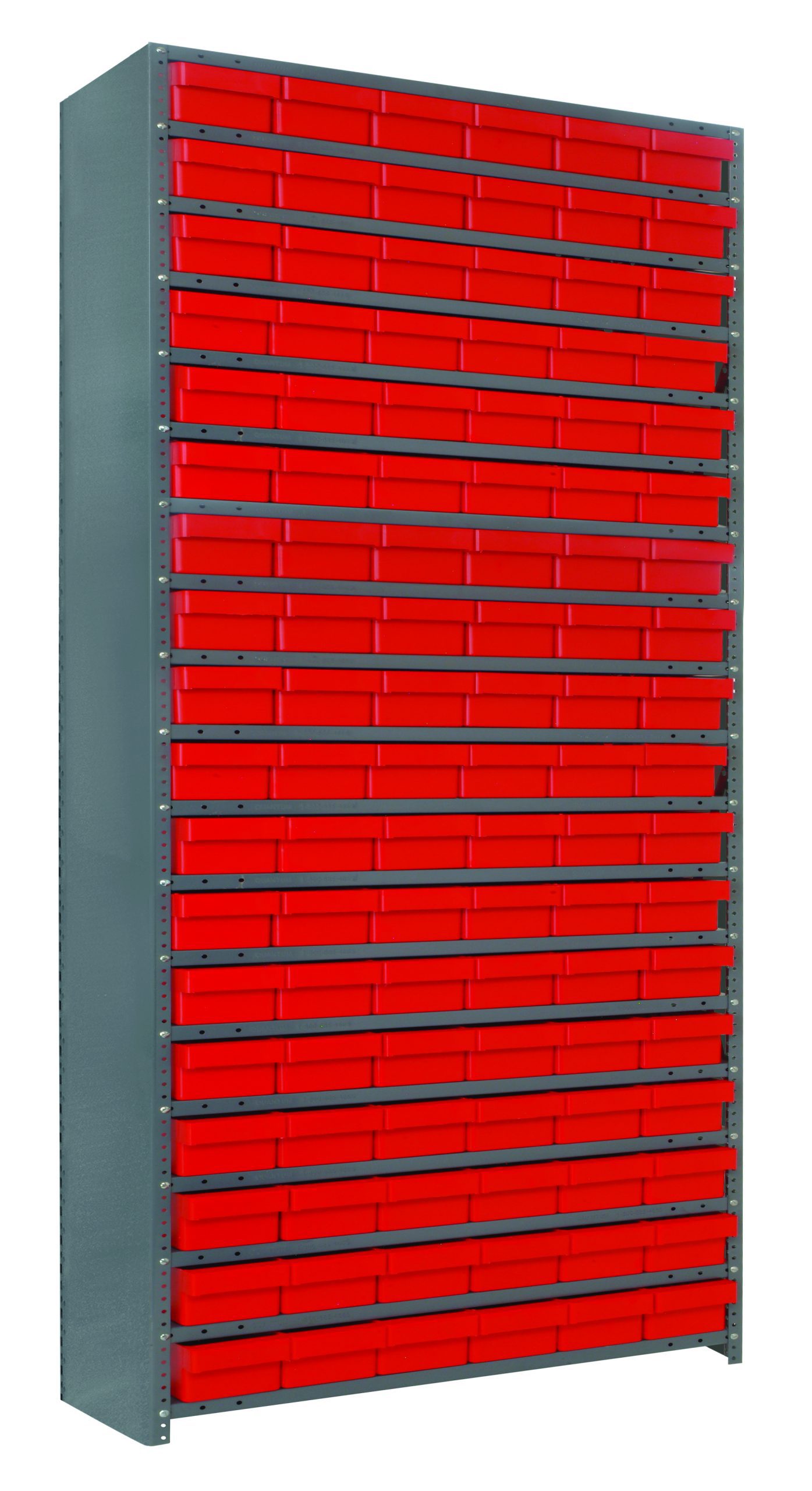 Quantum Shelving Unit, 12″D X 36″L X 75″H, Heavy Duty, 400 Lb. Load Capacity Per Shelf, Includes: (19) Shelves, (27) 11-5/8″L X 5-9/16″W X 2-1/8″H (QED401) Red Black Bins, Uprights And Cross Bars, Galvanized Steel Finish – QM-CL1275-401RD