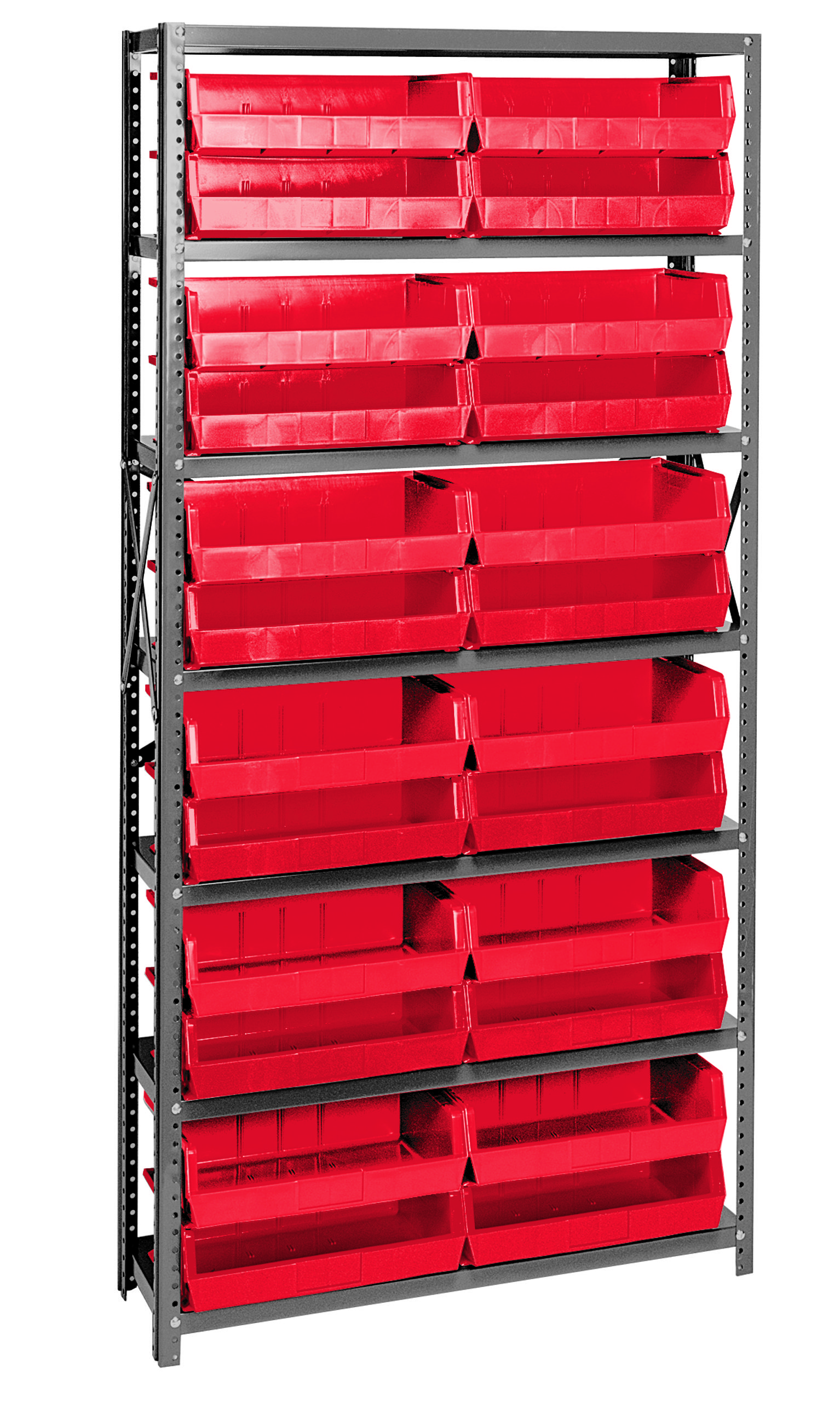 Shelving Unit, 12″D x 36″L x 75″H, heavy duty, 400 lb. load capacity per shelf, includes: (7) shelves and (24) QUS245 red bins, uprights and cross bars, galvanized steel finish