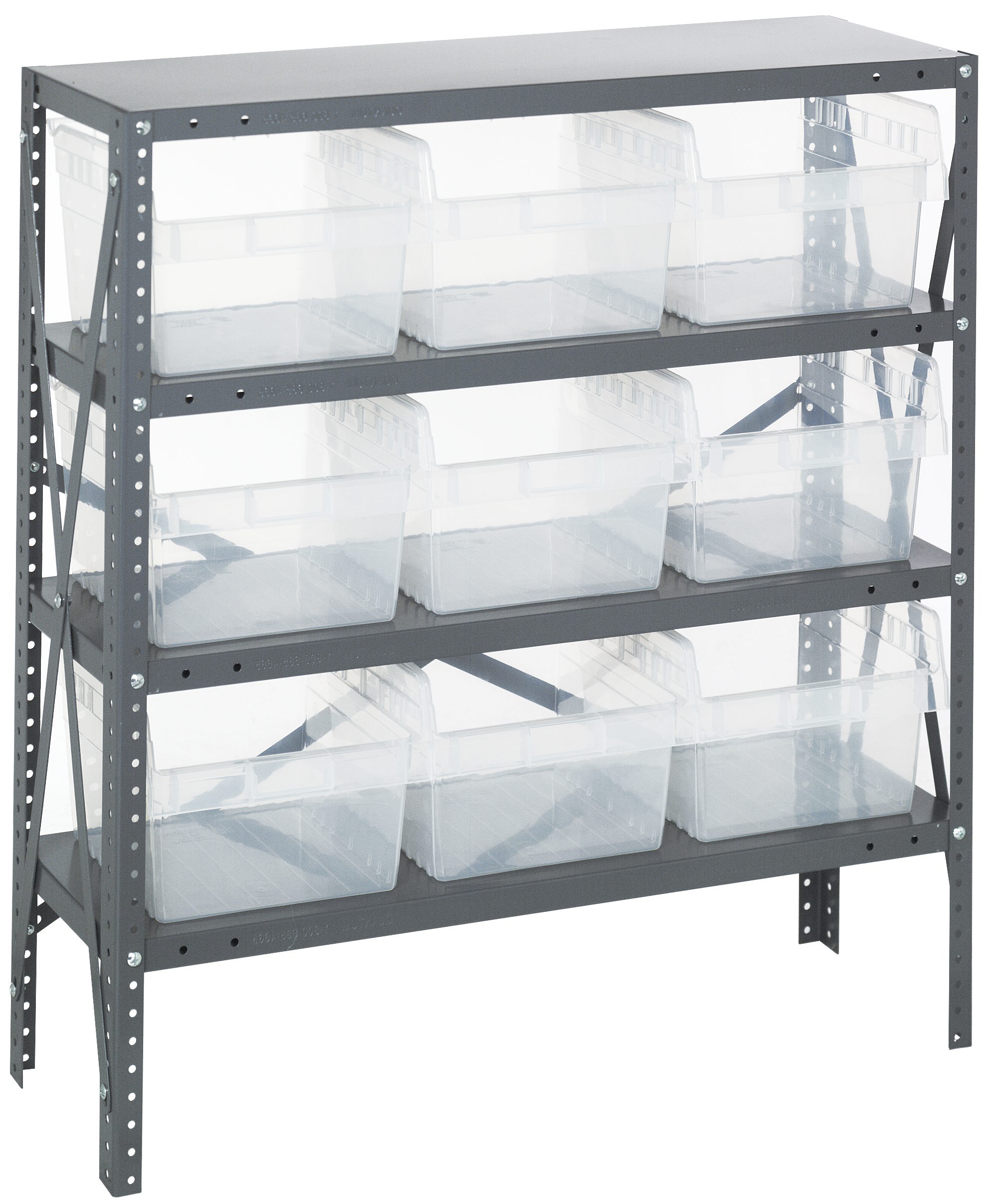 Shelving Unit, 18″D x 36″L x 39″H, heavy duty, 400 lb. load capacity per shelf, includes: (4) shelves, (9) 17-7/8″L x 11-1/8″W x 8″H (QSB810) clear black bins, uprights and cross bars, galvanized steel finish