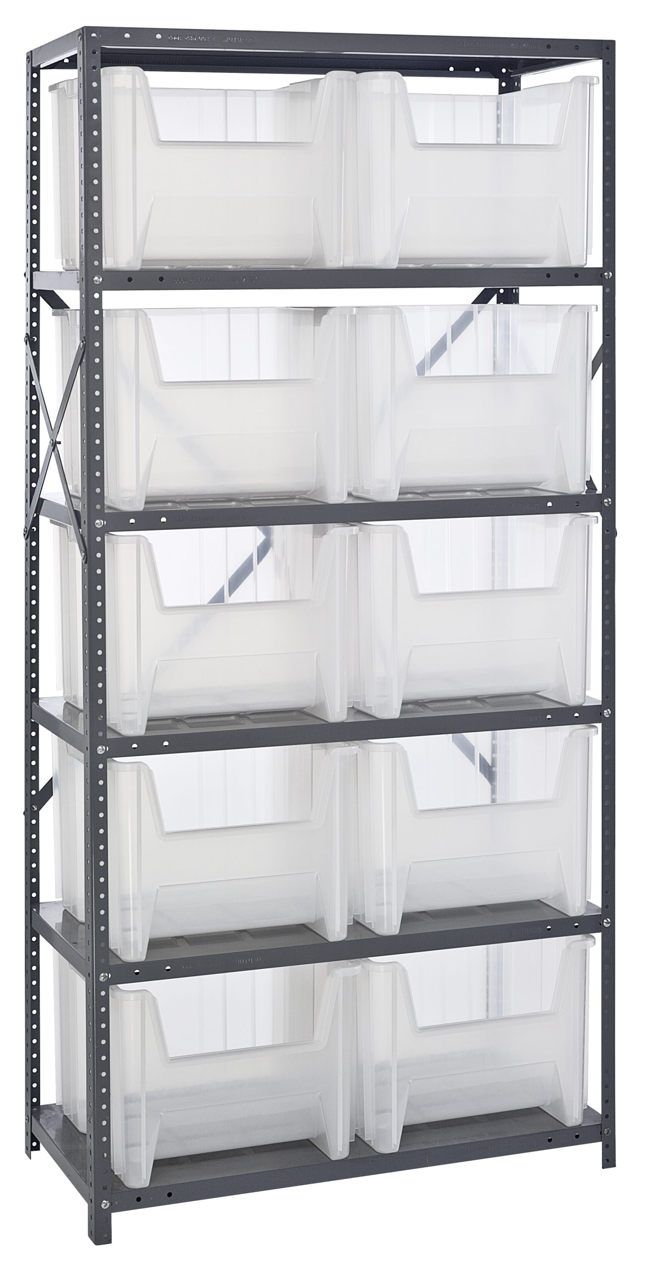 Shelving Unit, 18″D x 36″L x 75″H, heavy duty, 400 lb. load capacity per shelf, includes: (6) shelves and (10) QGH800 clear bins, uprights and cross bars, galvanized steel finish