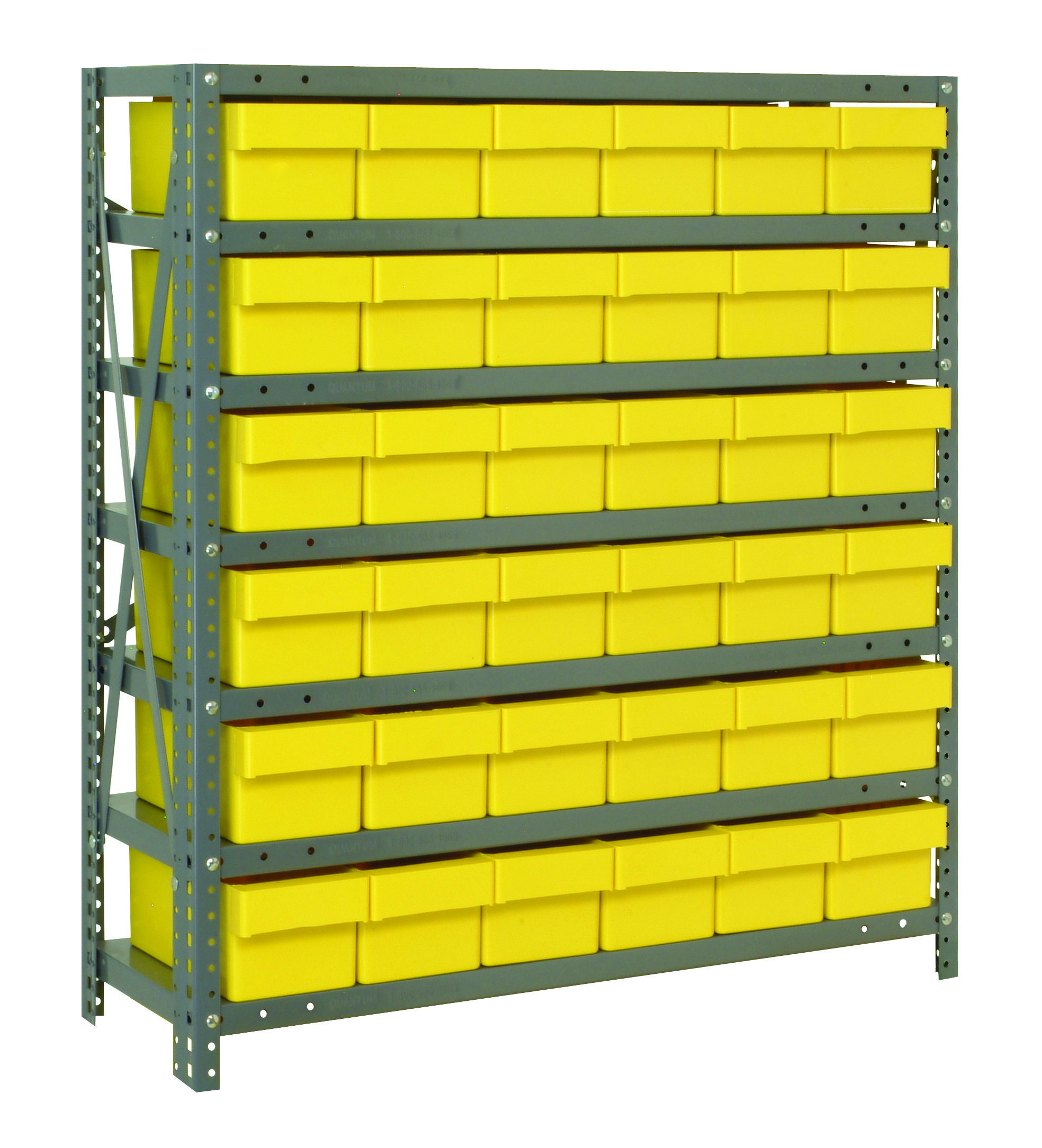 Shelving Unit, 24″D x 36″L x 39″H, heavy duty, 400 lb. load capacity per shelf, includes: (7) shelves, (36) 24″L x 5-9/16″W x 4-5/8″H (QED603) yellow black bins, uprights and cross bars, galvanized steel finish