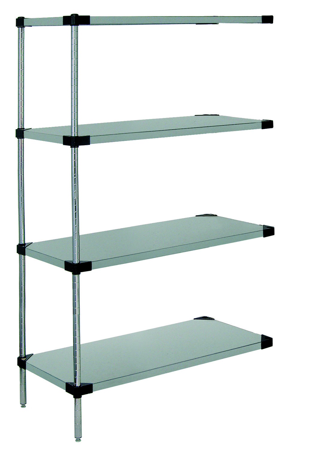 Solid Shelving Add-On Kit, 42″W x 24″D x 54″H, 300 – 600 lb. capacity, includes (4) solid shelves, (4) posts and (8) S-Hooks, 304 stainless steel, NSF, shipped KD