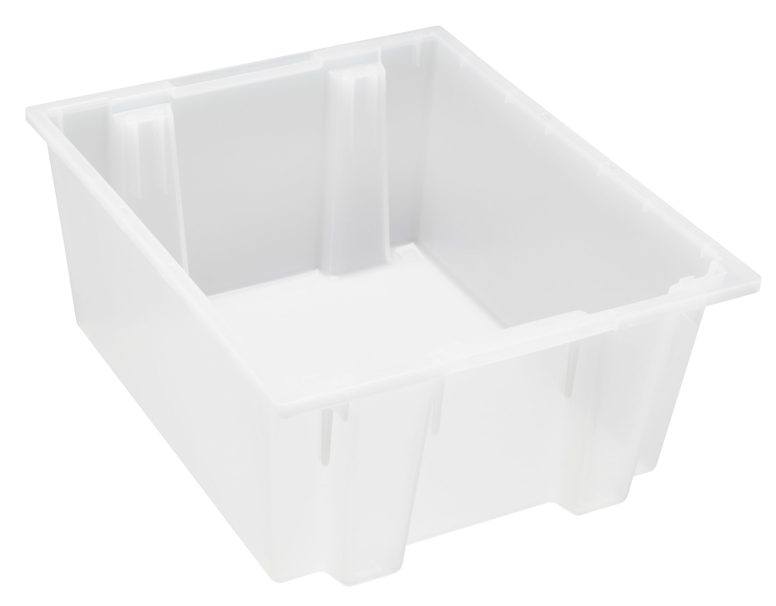 Stack and Nest Tote, 23-1/2″W x 19-1/2″D x 10″H, heavy duty, 2.00 cu. ft. capacity, clear polypropylene, Made in USA (priced per each, 3 each per carton)