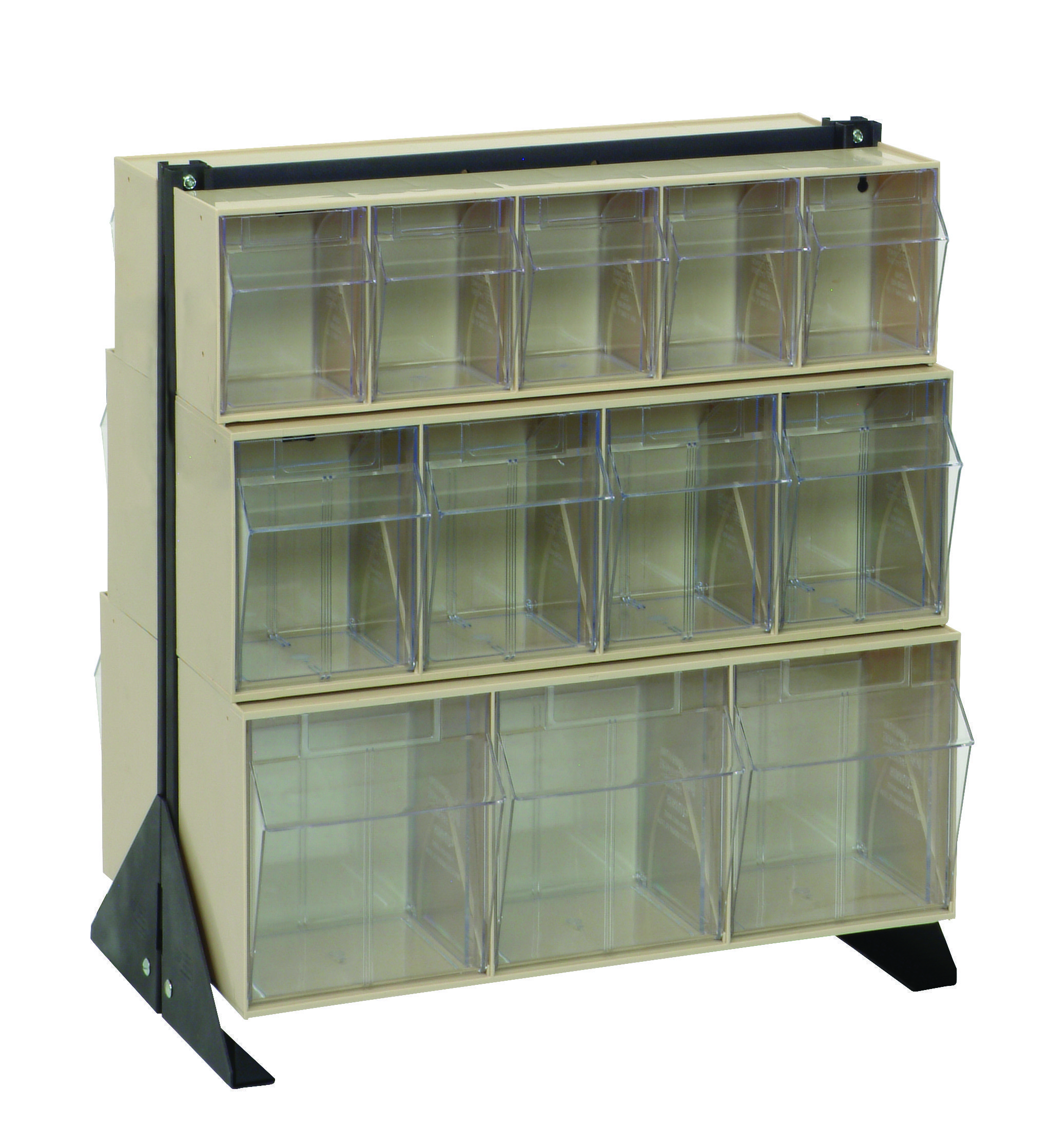 Tip Out Bin Floor Stand, double sided, 20-1/4″D x 23-5/8″W x 28″H, includes: (2) QTB303, (2) QTB304 and (2) QTB305 ivory bins, 14 gauge steel, black coated finish