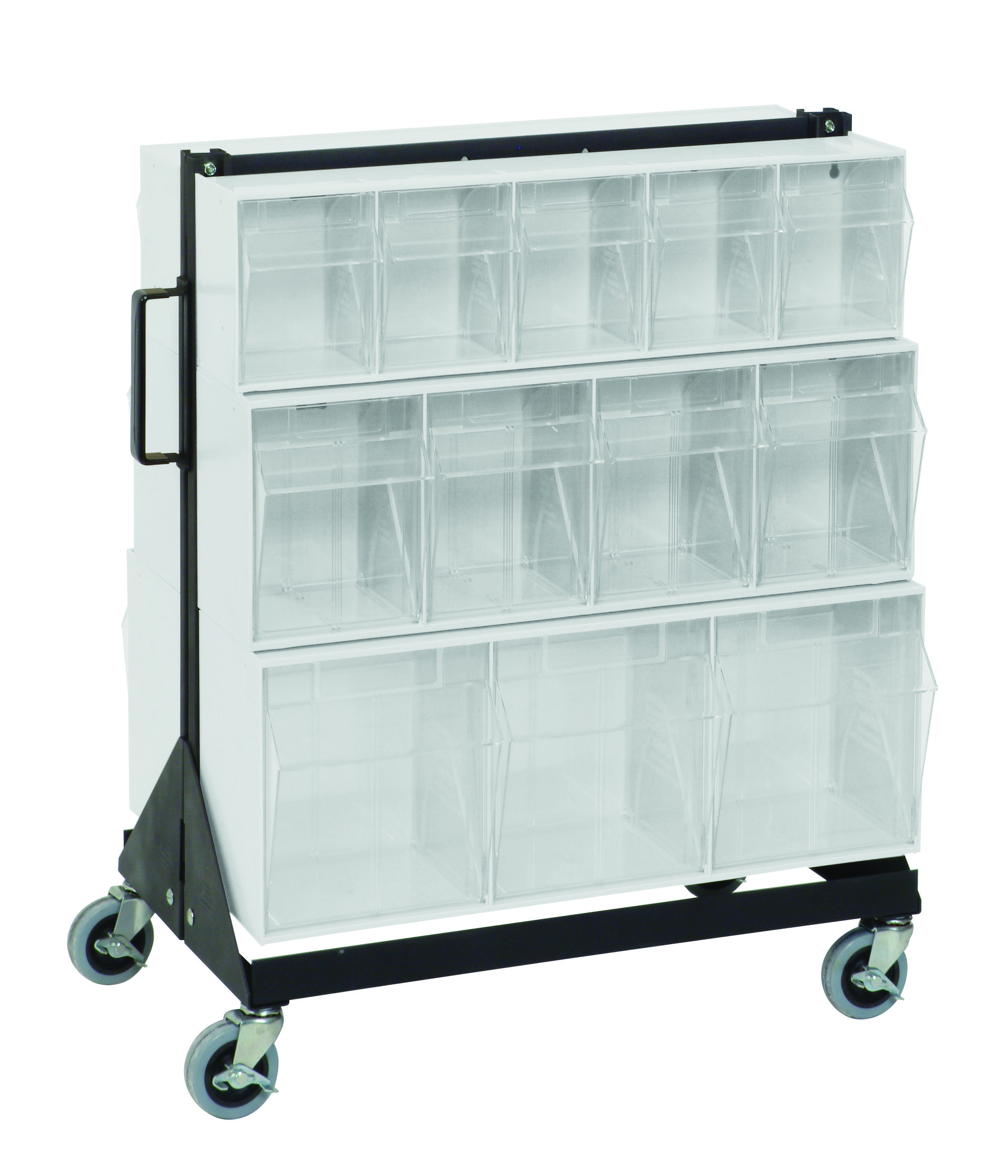Tip Out Bin Floor Stand, double sided, mobile, 20-1/4″D x 23-5/8″W x 31″H, 500 lbs. load capacity, includes: (2) QTB303, (2) QTB304, (2) QTB305 white bins and caster kit, 14 gauge steel, black coated finish