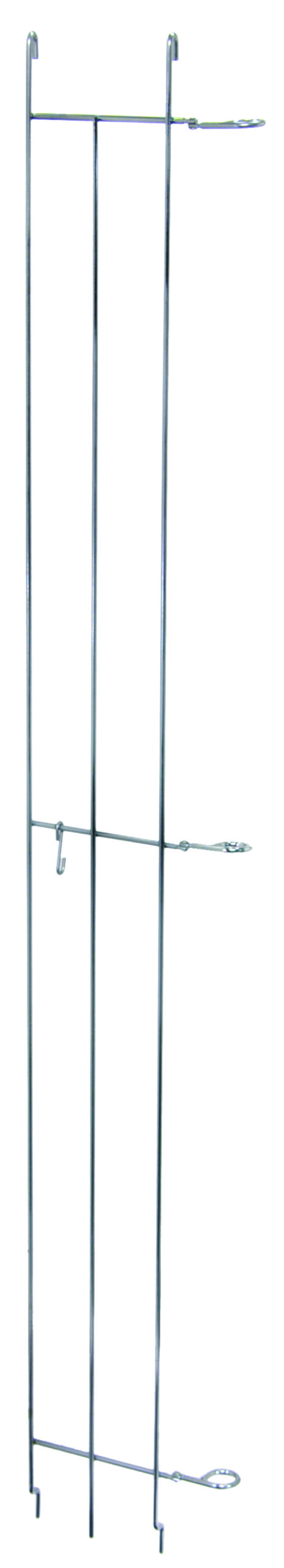 The Quantum Tray Slide features a 62D vertical metal frame with two parallel rods, horizontal bars, hooks, and loops. Its NSF certified and chrome-plated with a tray slide feature for climbing plants or as a garden trellis. Capacity for 10 trays.