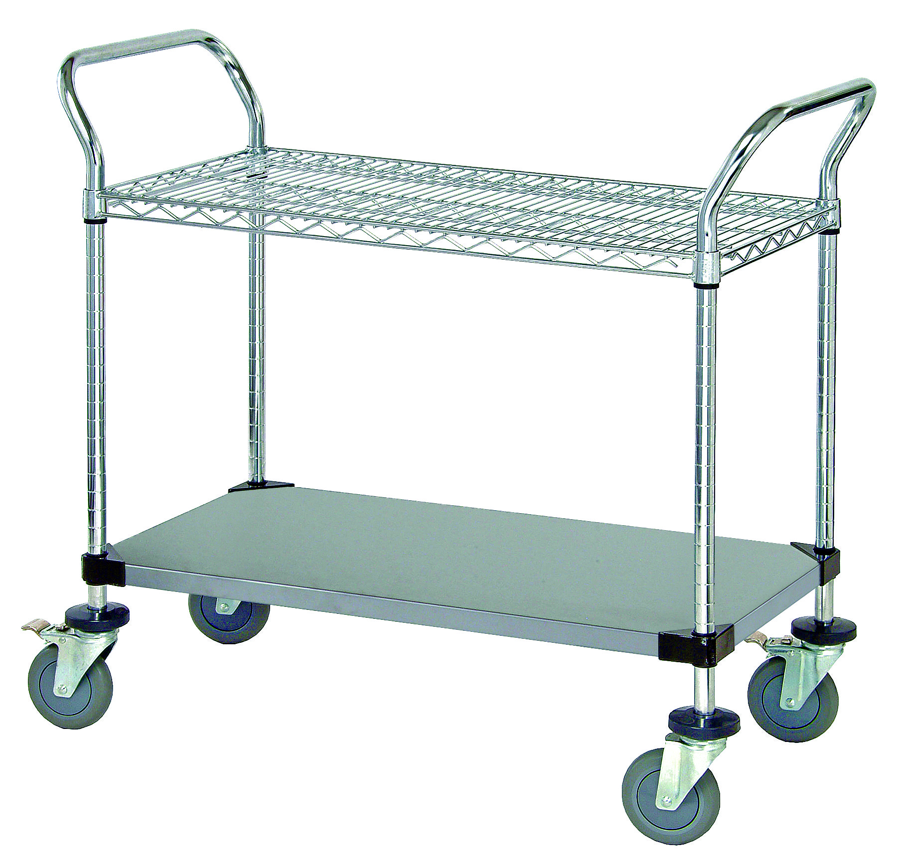 Quantum Utility Cart, 48″W X 24″D X 37-1/2″H, (1) Wire Shelf, (1) Solid Shelf, 1200 Lb. Capacity, (2) “U” Shaped Handles, Open Base, Donut Bumpers, (4) 5″ Polyurethane Swivel Casters (2 With Brakes), 304 Stainless Steel, NSF