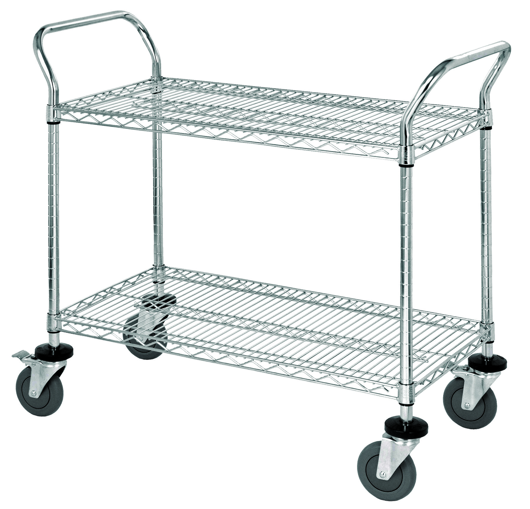 Quantum Utility Cart, 72″W X 24″D X 37-1/2″H, (2) Wire Shelves, 1200 Lb. Capacity, (2) “U” Shaped Handles, Open Base, Donut Bumpers, (4) 5″ Polyurethane Swivel Casters (2 With Brakes), 304 Stainless Steel Finish, NSF