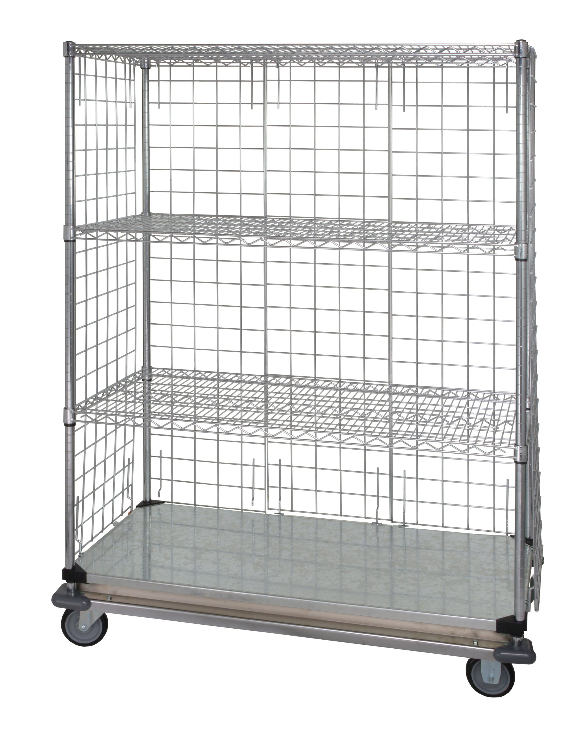 Wire Enclosed Cart, mobile, 36″W x 24″D x 69″H, 1200 lb. capacity, includes: (3) wire shelves, (1) solid galvanized steel shelf, (4) 63″H post, (4) enclosure panels, (1) dolly base, (4) plate thermoplastic resin casters (2 rigid, 2 swivel with brakes), chrome plated finish