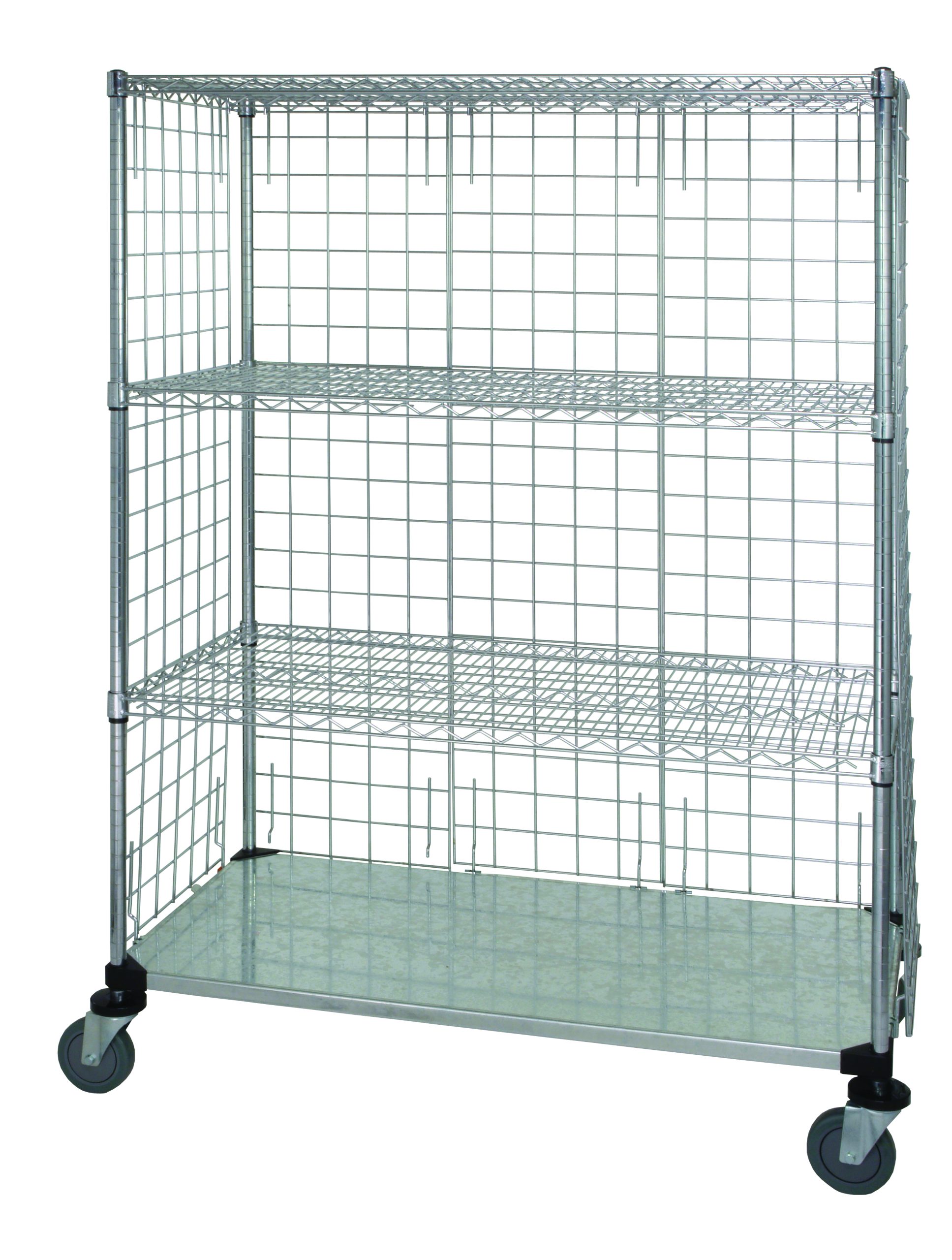 Wire Enclosed Cart, mobile, 36″W x 24″D x 69″H, 1200 lb. capacity, includes: (3) wire shelves, (1) solid galvanized steel shelf, (4) 63″H post, (4) enclosure panels, (4) donut bumpers, (4) 5″ thermoplastic resin casters, chrome plated finish
