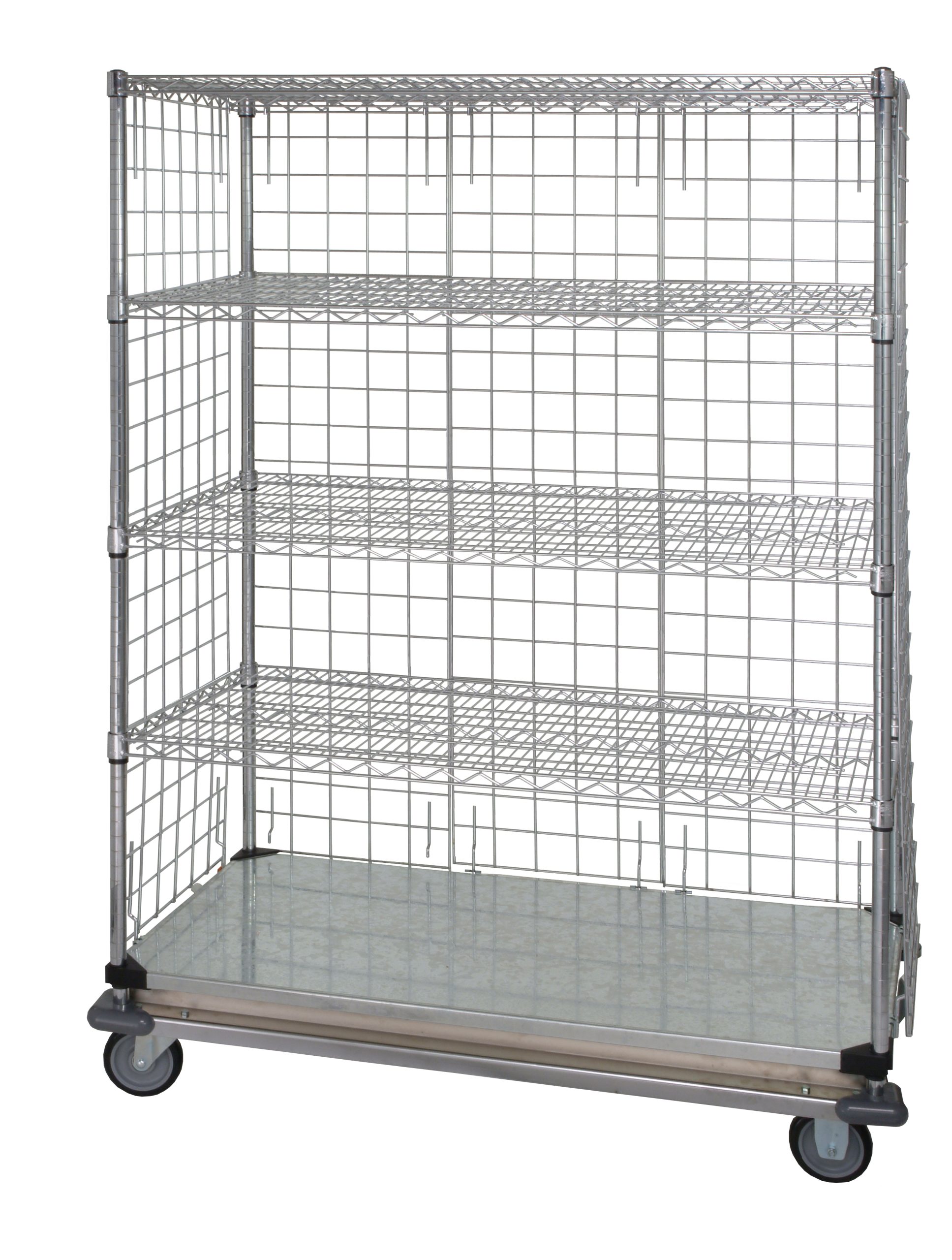 Wire Enclosed Cart, mobile, 36″W x 24″D x 80″H, 1200 lb. capacity, includes: (4) wire shelves, (1) solid galvanized steel shelf, (4) 74″H post, (4) enclosure panels, (1) dolly base, (4) plate thermoplastic resin casters (2 rigid, 2 swivel with brakes), chrome plated finish