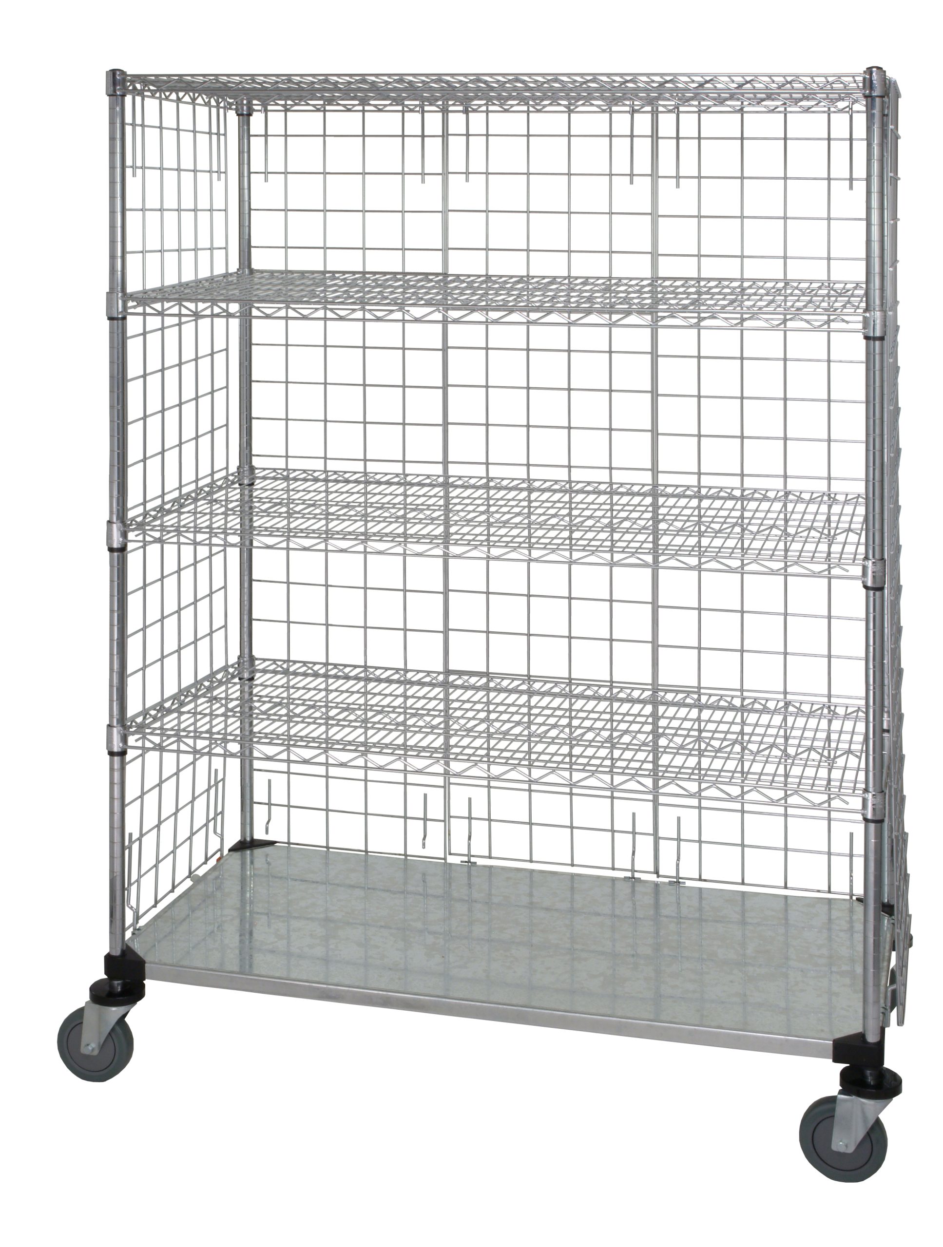 Wire Enclosed Cart, mobile, 36″W x 24″D x 80″H, 1200 lb. capacity, includes: (4) wire shelves, (1) solid galvanized steel shelf, (4) 74″H post, (4) enclosure panels, (4) donut bumpers, (4) 5″ thermoplastic resin casters, chrome plated finish