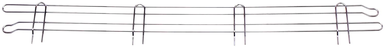 The Quantum Back Ledge features a sleek chrome-plated wire frame design with three horizontal bars and four vertical supports, measuring 72W x 4H. It ends in curved hooks for versatile hanging or securing, perfect for back ledge organization.