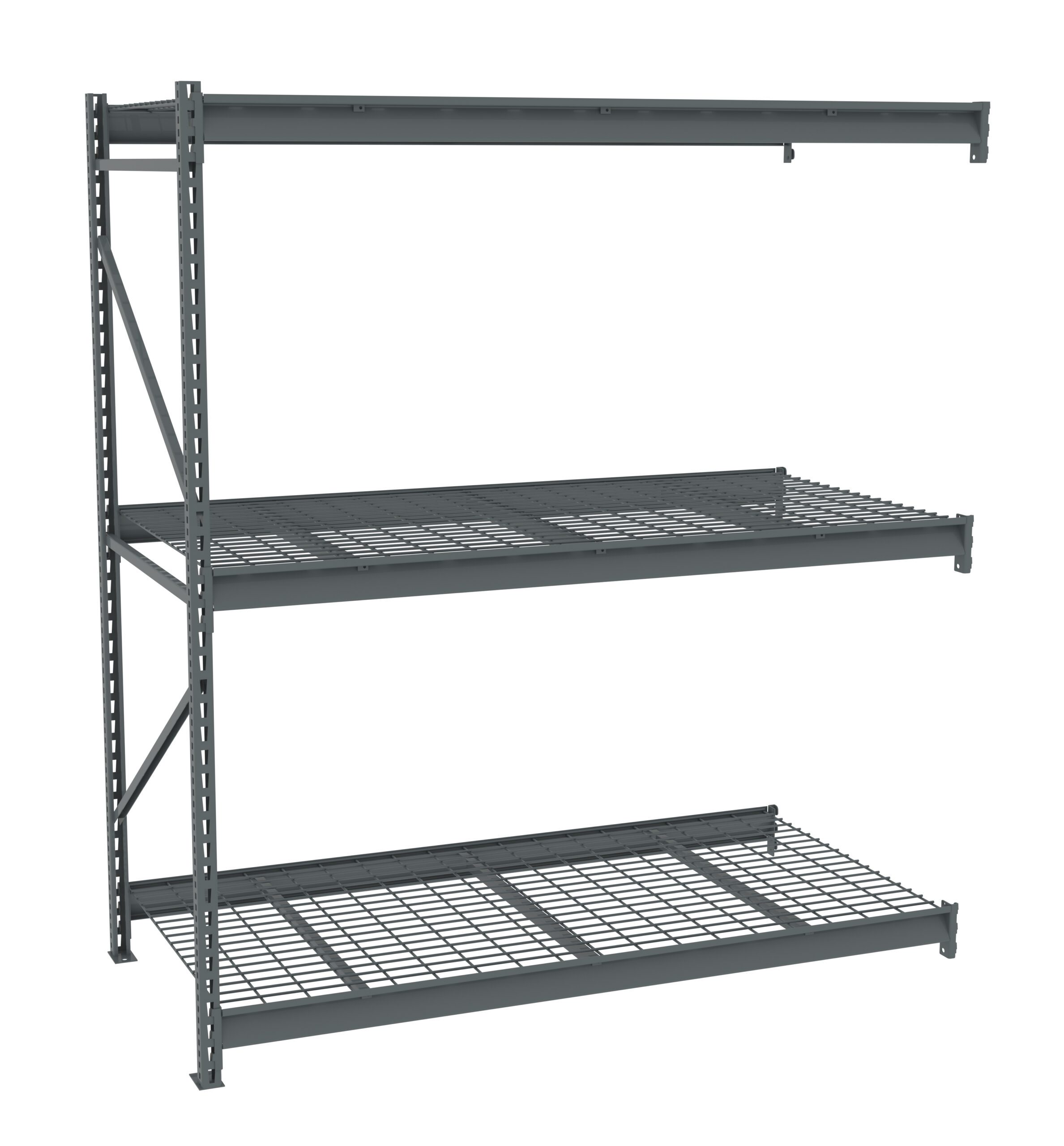 Bulk storage units go together fast and easy. Beams simply slide into place. Superior beams lock into the uprights on 2” centers. Specially formed beams add strength at the front and rear of shelf edges. Wire decking uses 5 gauge wire and consists of a 2″ x 4″ mesh pattern.