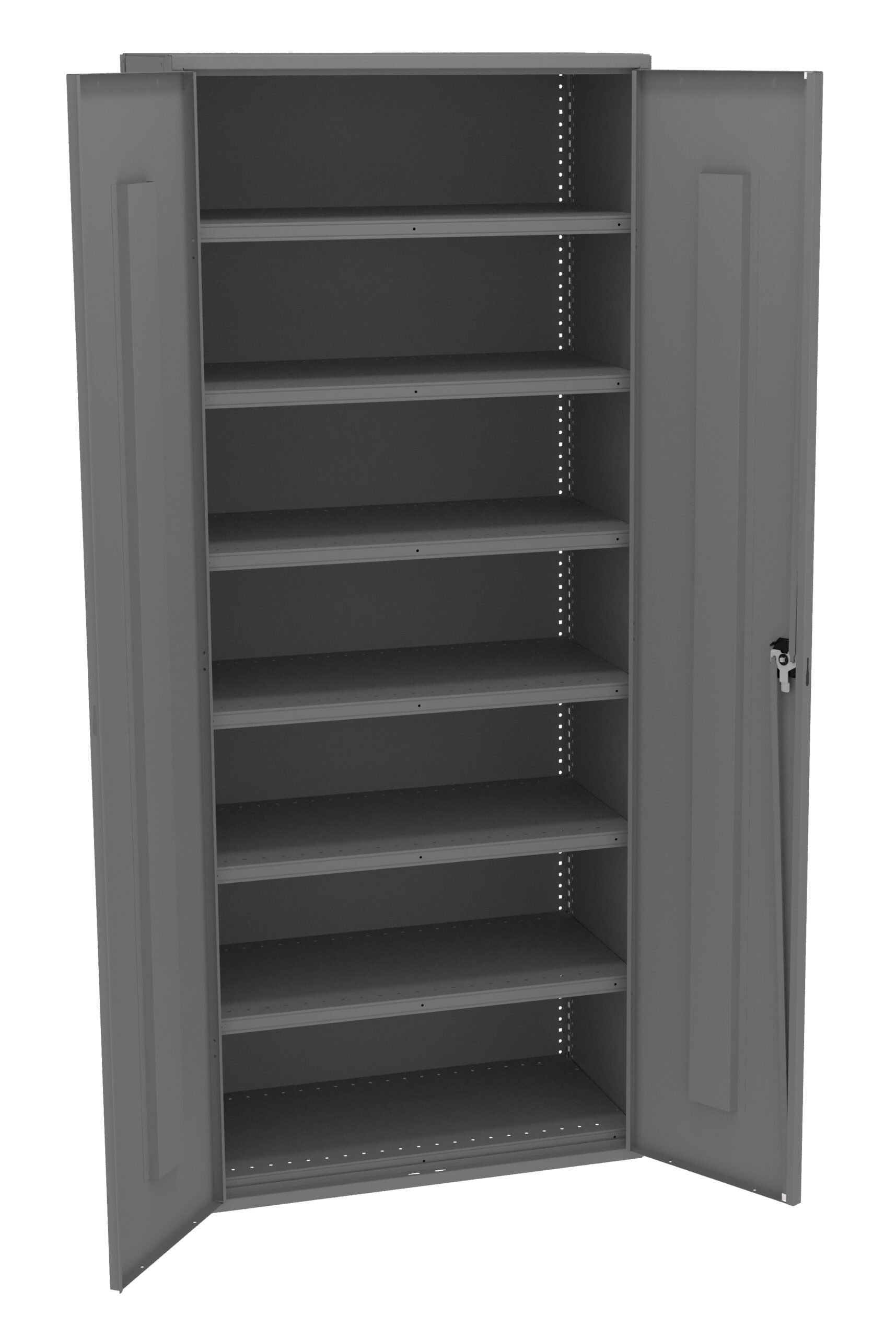 Hinged doors come standard with one recessed handle. Closed style units are ideal for storing small or loose items. Shelf corners are fully lapped and welded for extra strength. Shelves can be adjusted quickly and easily in 1” increments to make maximum use of vertical space. 13-Gauge compression clips make adding shelves simple. Specially designed square locater slots allow for easy adjustability. Unit depth does not include 1 1/4” depth of door frame or 1/2” depth of handle.