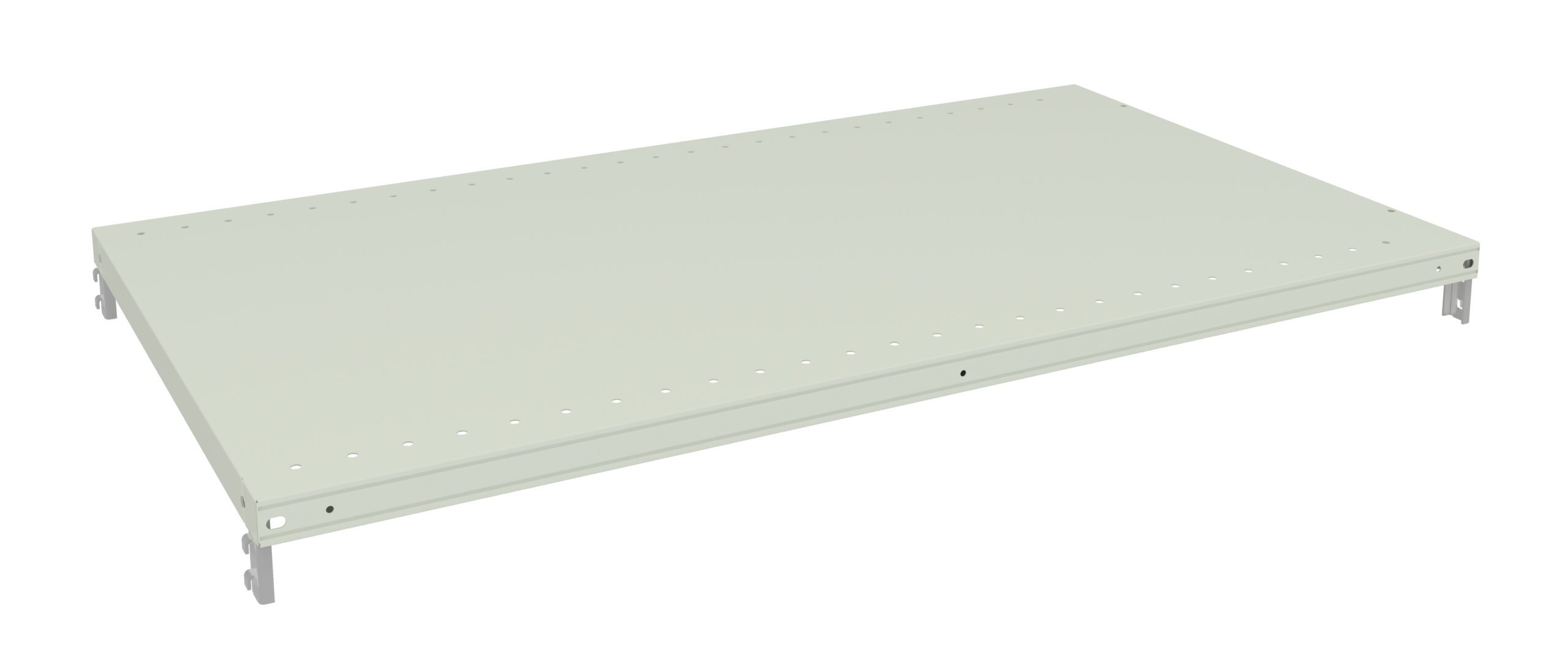 A flat, rectangular metal shelf with a light green finish, featuring rounded corners and small holes along the edges for mounting.