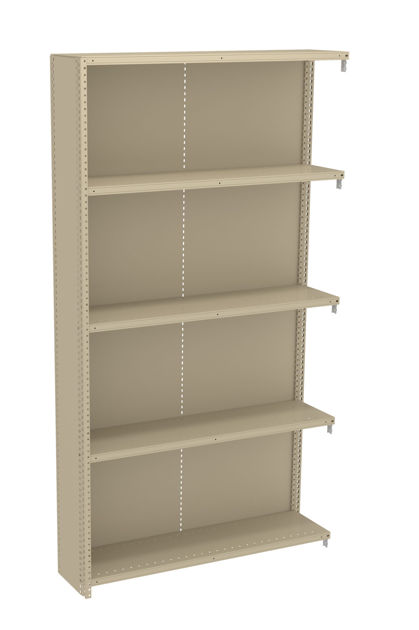Closed style units are ideal for storing small or loose items. Shelf corners are fully lapped and welded for extra strength. Shelves can be adjusted quickly and easily in 1” increments to make maximum use of vertical space. 13-Gauge compression clips make adding shelves simple. Specially designed square locater slots allow for easy adjustability.