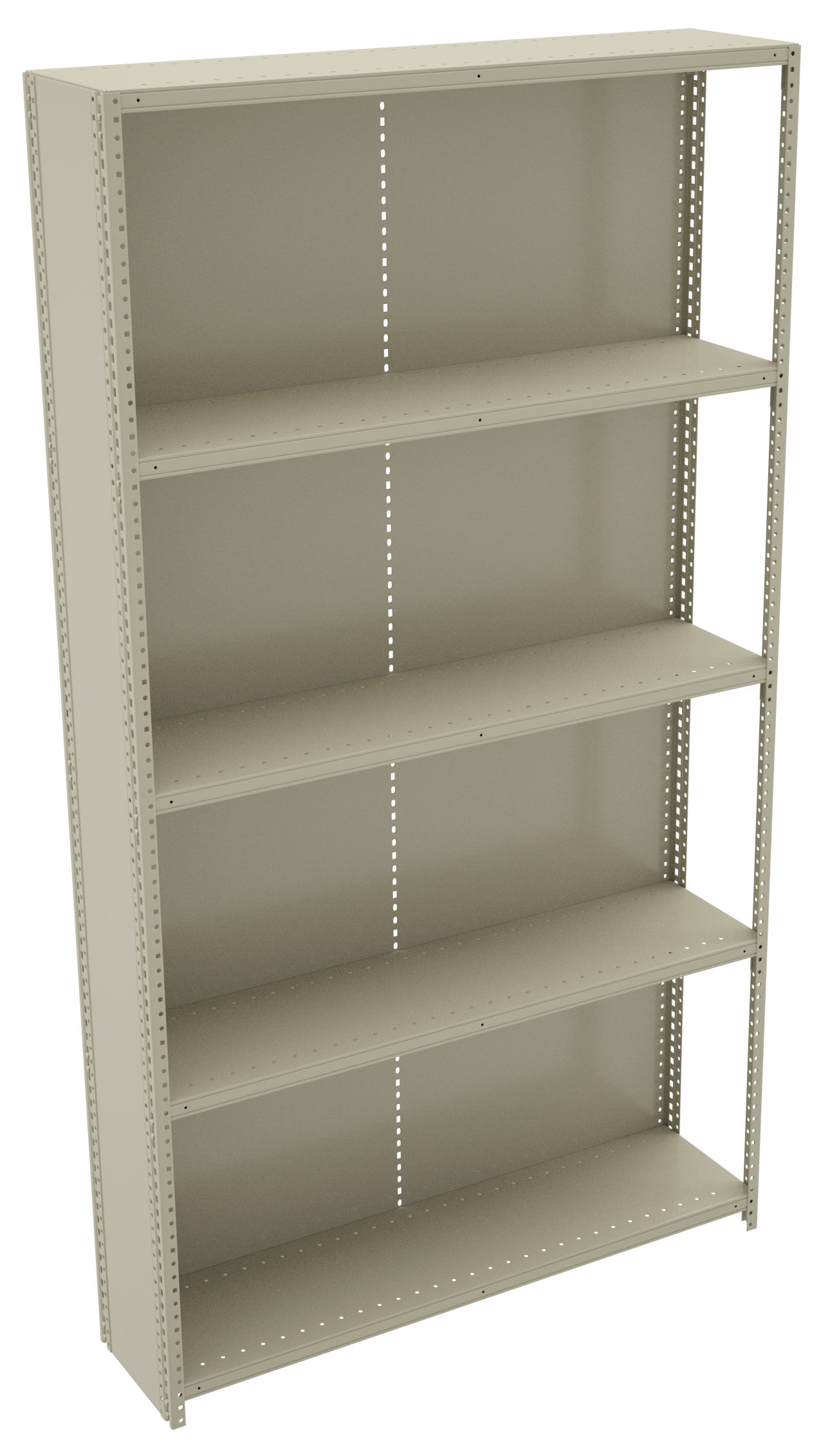 A beige metal shelving unit with five evenly spaced shelves. The unit has perforated edges for adjustable shelving heights. It is empty and stands against a plain white background.