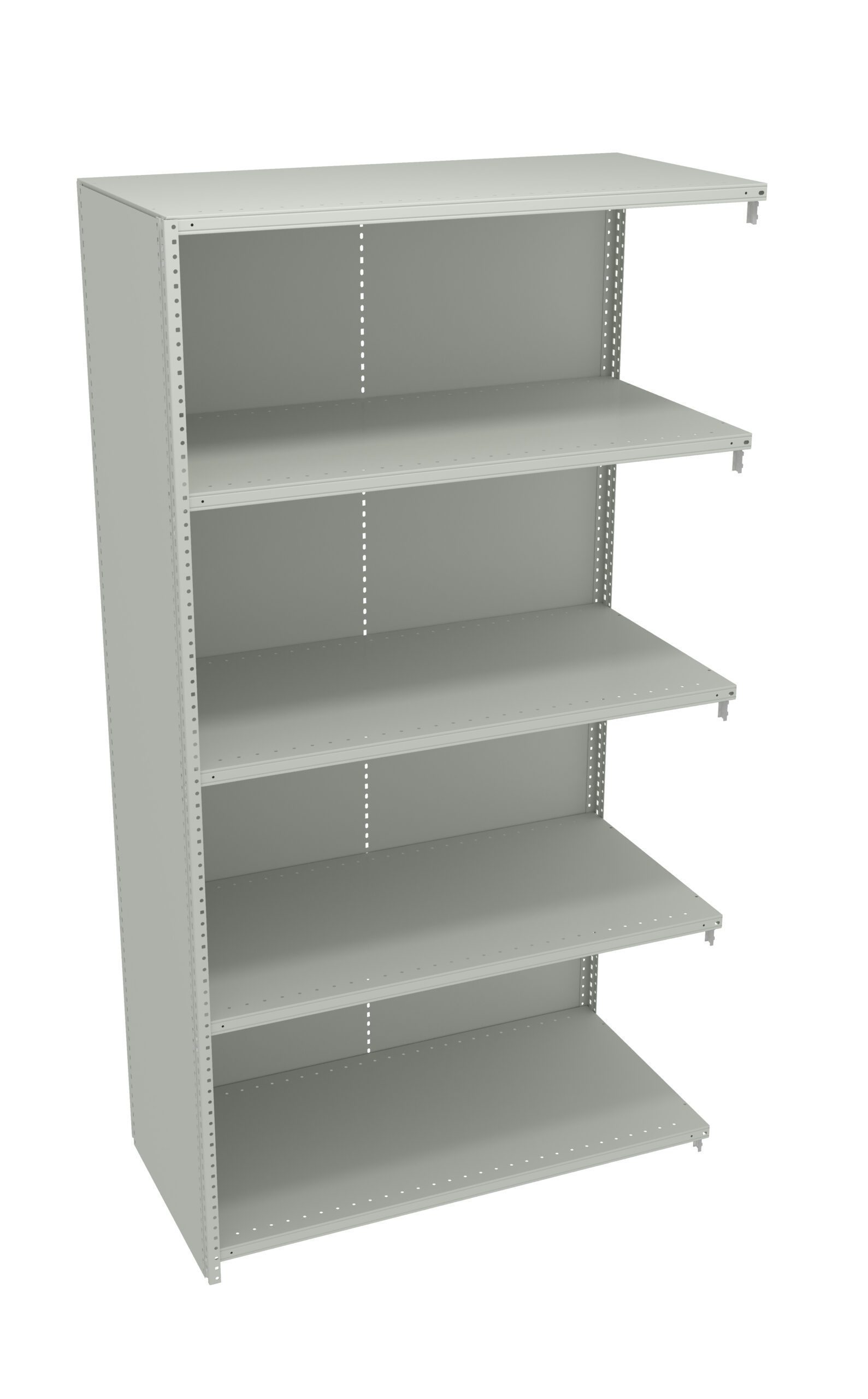 Closed style units are ideal for storing small or loose items. Shelf corners are fully lapped and welded for extra strength. Shelves can be adjusted quickly and easily in 1” increments to make maximum use of vertical space. 13-Gauge compression clips make adding shelves simple. Specially designed square locater slots allow for easy adjustability.