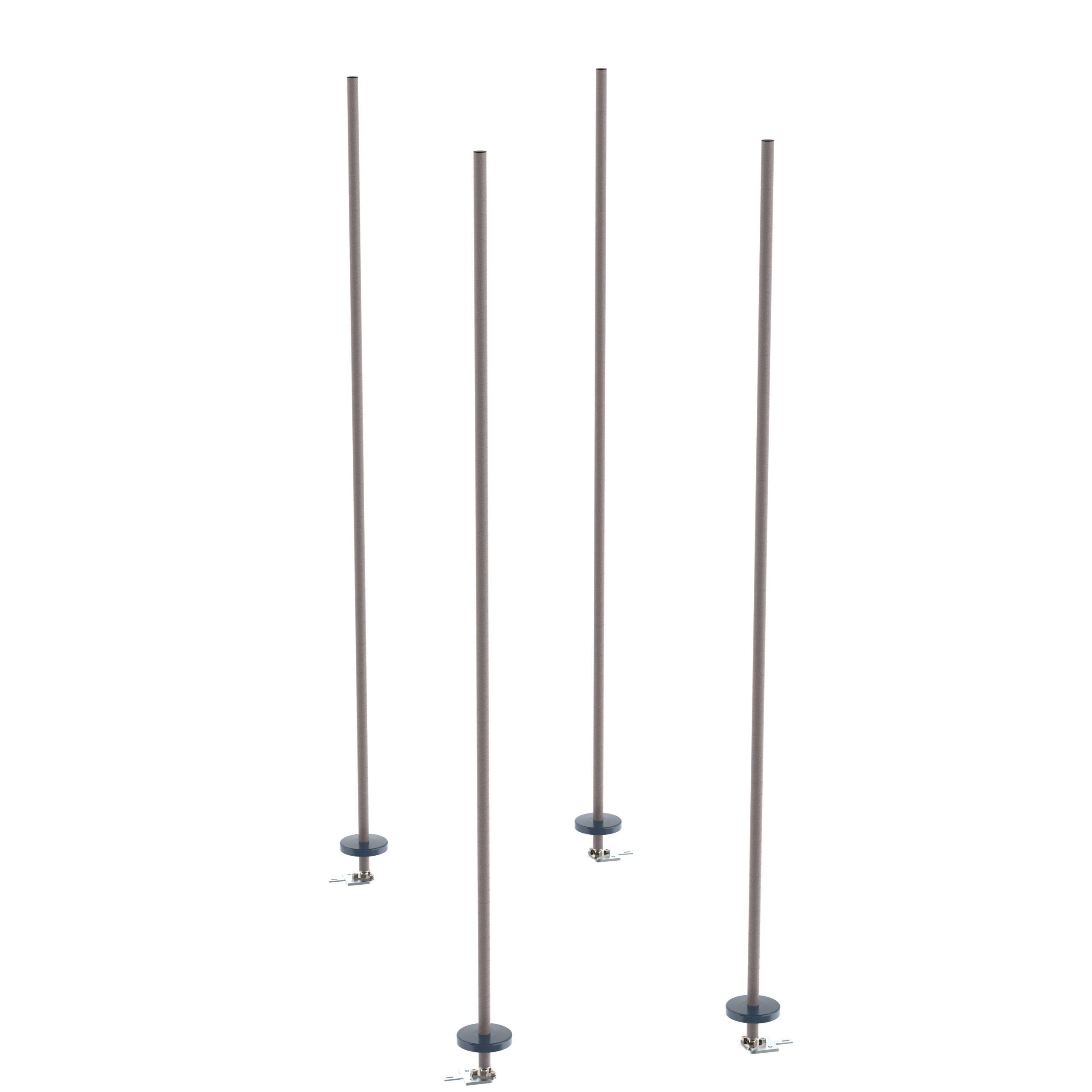 Four tall, slender poles with black bases on a white background, each with a fixture near the base, resemble the Metro BTAK4 qwikTRAK Stationary Intermediate Unit Kit for Super Erecta Wire Shelving in Metroseal Gray Epoxy.