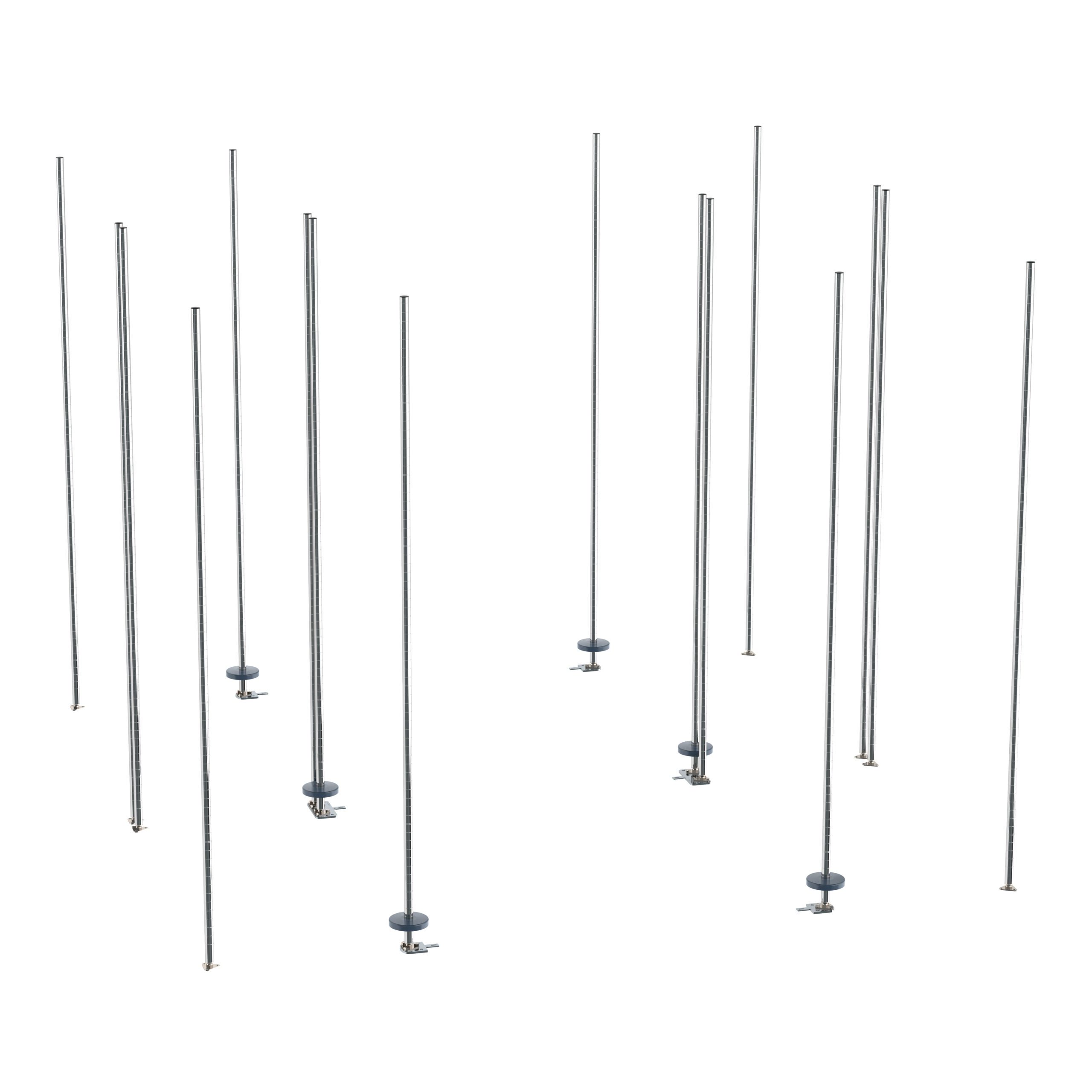 A: The kit includes 74″ high stationary posts, chrome-plated foot plates, and hardware necessary for connecting double deep stationary end units to tracks. Shelves are sold separately.