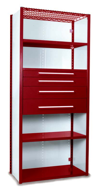 V Grip Shelving with Drawers — V-Grip Shelving with Drawers – 18 Gauge Design Benefits and Features include: industry leader in structural integrity; combine the best of drawer and shelving storage in one unit, bulk storage space for larger items is available on shelving over and below drawers for small parts stored ergonomically in the “Gold Zone” between shoulders and knees for easy access. 100% drawer extension provides full drawer access, 200 lbs. (36″ width) and 400 lbs. (36″ and 48″ width) capacities available. Exclusive v-grip compression design, durable enamel paint finish, available in open and closed(Back and sides) configurations. Regardless of color selected for shelving, all side and back panels are reflective white to enhance visibility.Equipto V-Grip Shelving with Drawers Unit – 4 Drawers/5 Shelves 7×1.5×3 Closed Starter,3″, 4.5″, 6″, 7.5″ Drawers