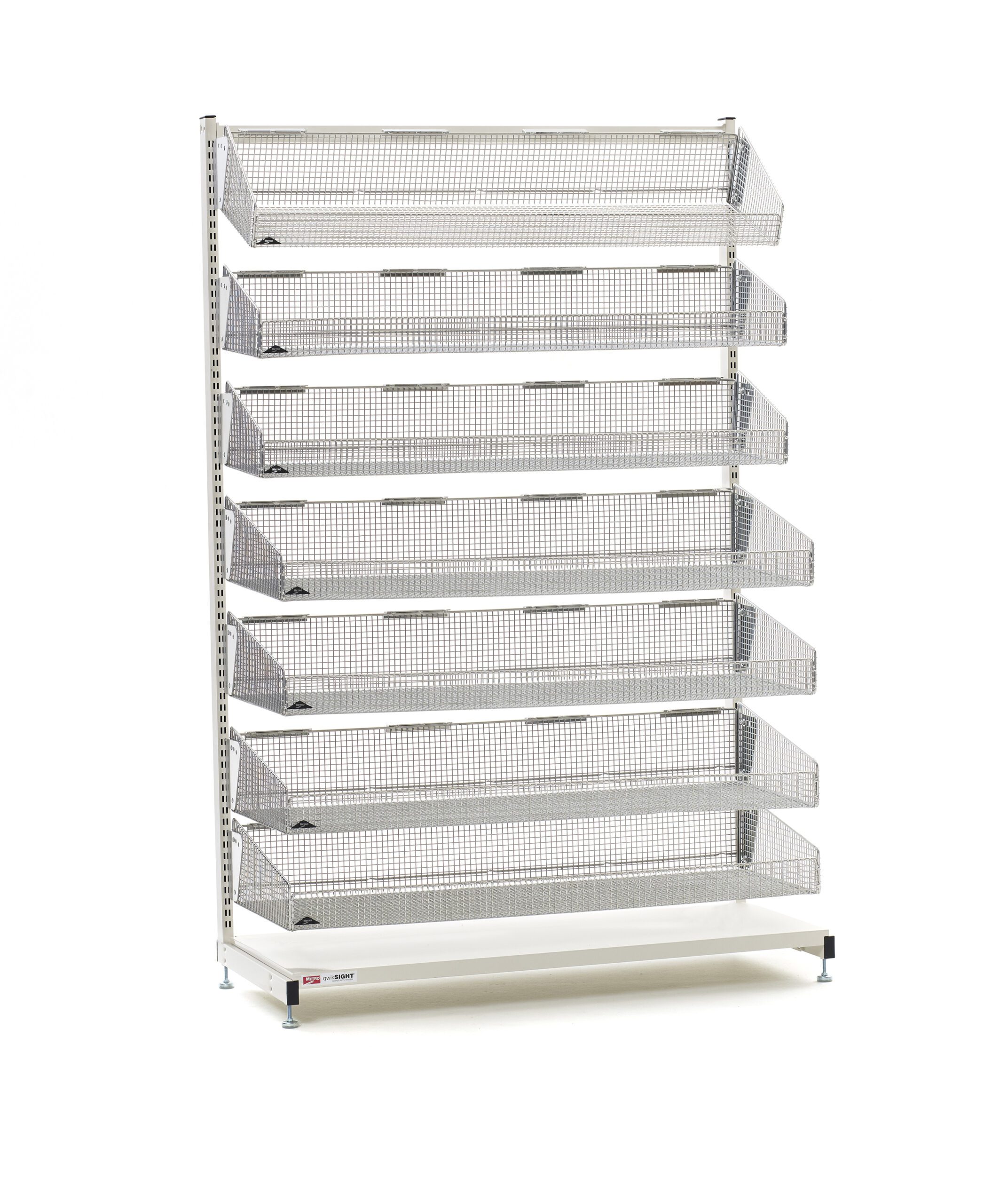 - Can the baskets be adjusted?Yes, the baskets can be adjusted at 1″ intervals and set at different angles (horizontal, 11°, or 21° upward slant).