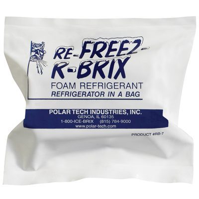 The product, 4 x 2 1/4 x 1 1/2 Re-Freez-R-Brix® Cold Bricks (48/Case), is from Polar Tech Industries, Inc. and comes in a white bag labeled Re-Freez-R-Brix Foam Refrigerant, featuring blue text and icons with product number RB-7 for optimal cold storage.