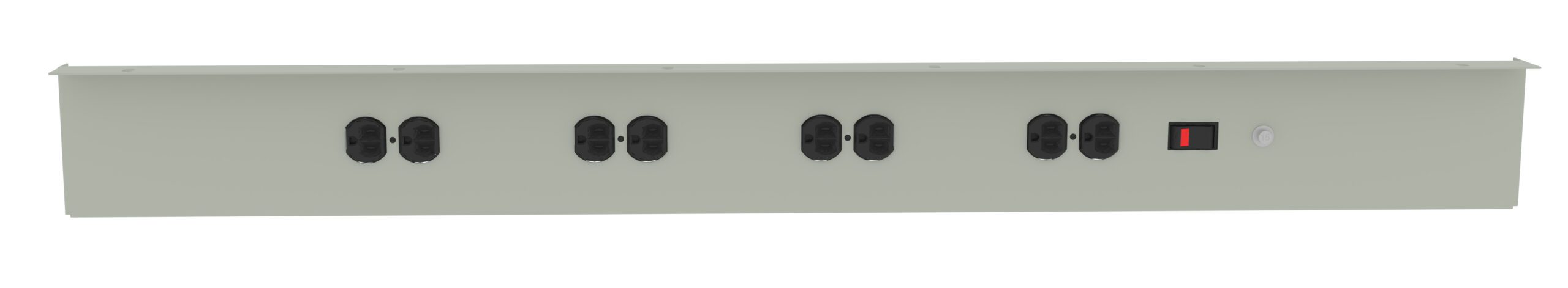 Provides mounting plate for four duplex outlets on panel leg workbenches. Wiring kit included and installed.