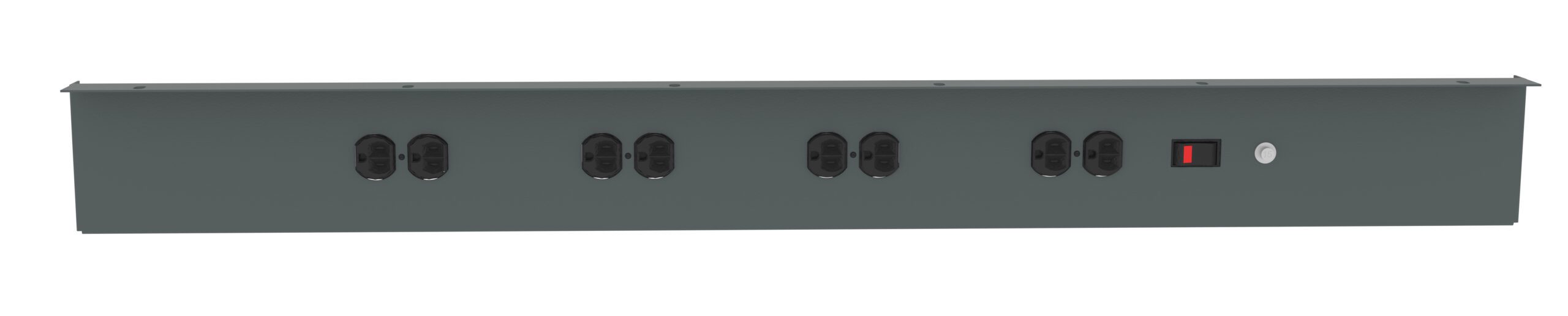 Provides mounting plate for four duplex outlets on panel leg workbenches. Wiring kit included and installed.