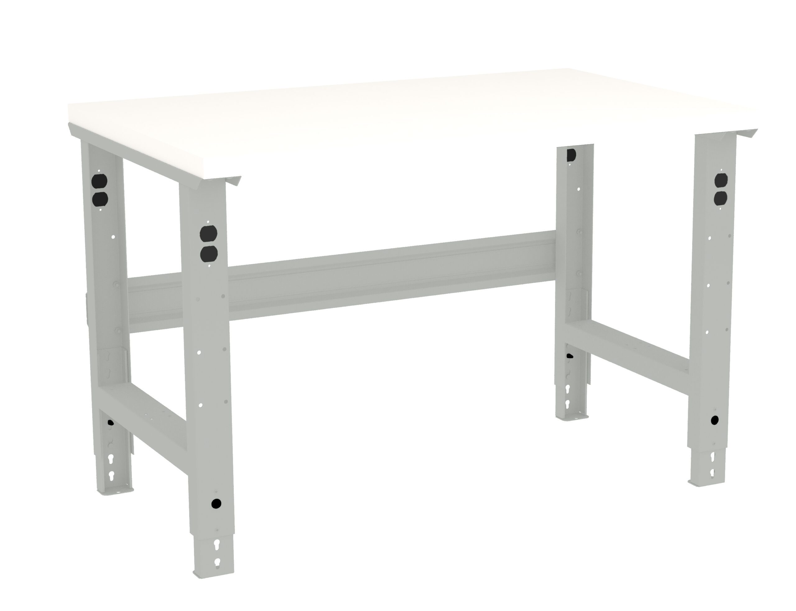 High pressure white plastic laminate top and edges with particleboard core. Now you can adjust workbenches to meet changing work requirements without replacing them. Legs adjust from 27 7/8″ to 35 3/8″ high in 1 1/2″ increments. 14 gauge stringer connects legs together for added stability. Knock-outs in legs allow for handy electrical outlets.
