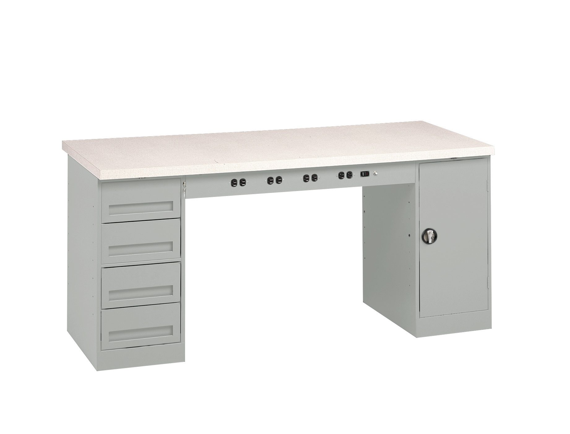 High pressure white plastic laminate top and edges with particleboard core. Tops supported by complete steel framework. Front panel will accept four duplex electrical outlets. Storage cabinet comes standard with locking recessed handle. One adjustable shelf included. 4-drawer modular cabinet comes standard with keylock which locks all drawers simultaneously. Drawer load capacity is 70 lbs.