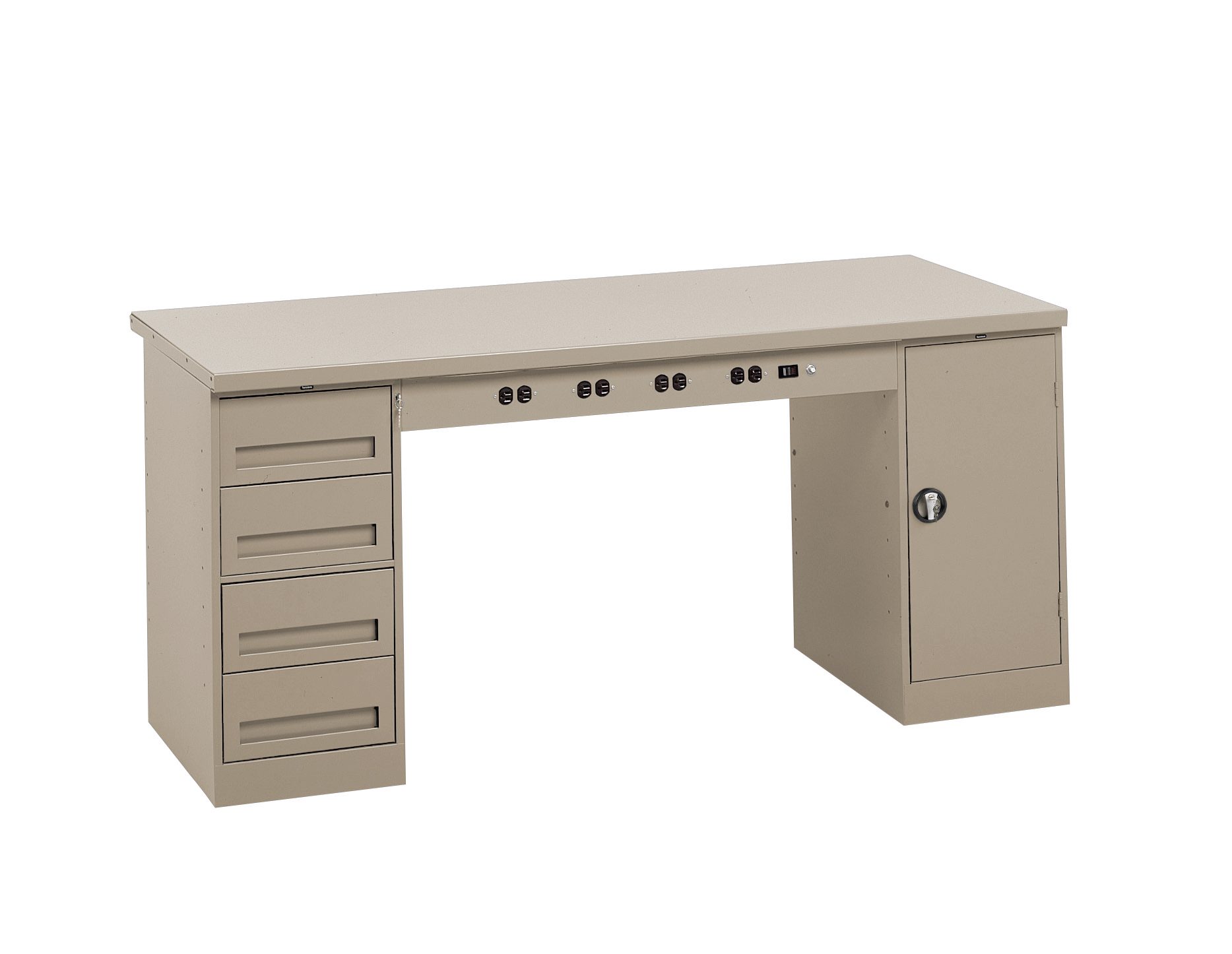Durable 12 gauge steel work surface reinforced with 14 gauge end channels. Tops supported by complete steel framework. Front panel will accept four duplex electrical outlets. Storage cabinet comes standard with locking recessed handle. One adjustable shelf included. 4-drawer modular cabinet comes standard with keylock which locks all drawers simultaneously. Drawer load capacity is 70 lbs.