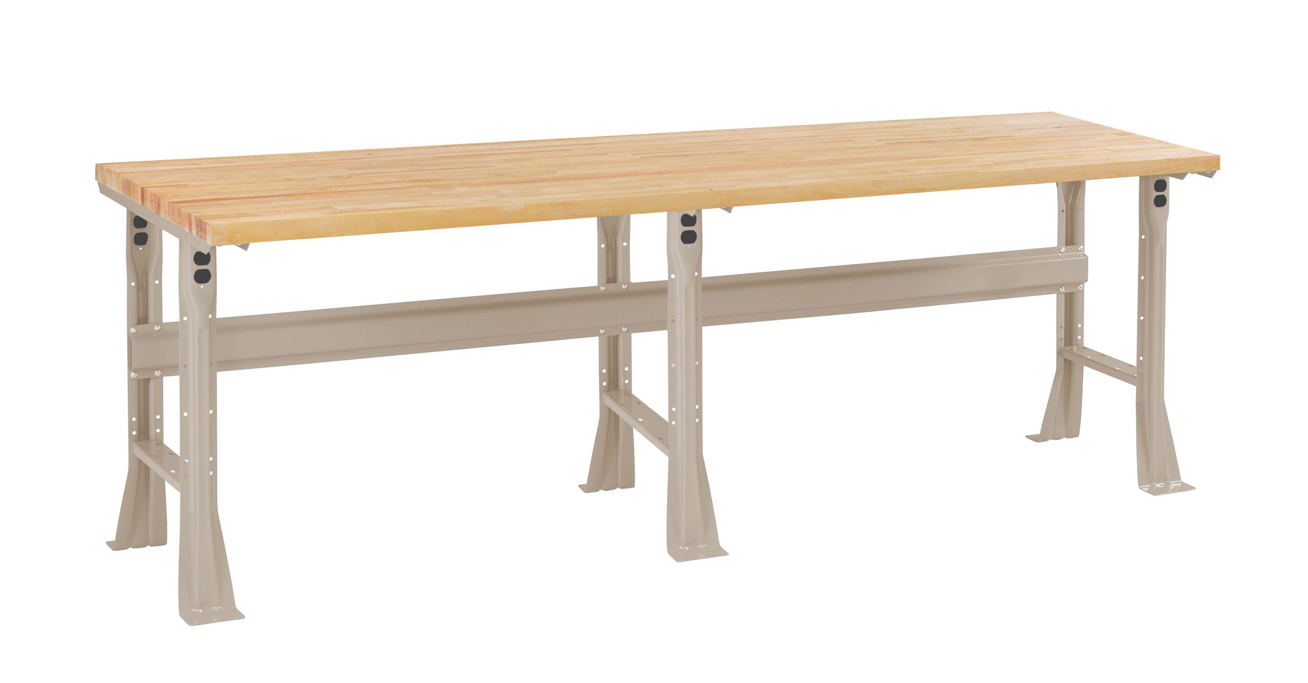 Solid laminated hardwood features butcher block construction to resist warp. Flared legs are constructed of all welded 13 gauge steel with 14 gauge lower cross members. Holes in feet permit bolting to the floor. 14 gauge stringer connects legs together for added stability. Knock-outs in legs allow for handy electrical outlets.