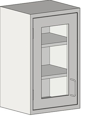 Wall cabinet, closed front, flat top, 13″D x 18″W x 31″H, left-hand hinged door with tempered glass insert and wire style pull, stainless steel construction, (2) adjustable intermediate shelves