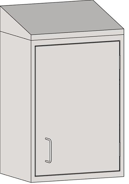 Wall cabinet, closed front, sloped top, 13″D x 18″W x 36″H, right-hand hinged door with wire style pull, stainless steel construction, (2) adjustable intermediate shelves