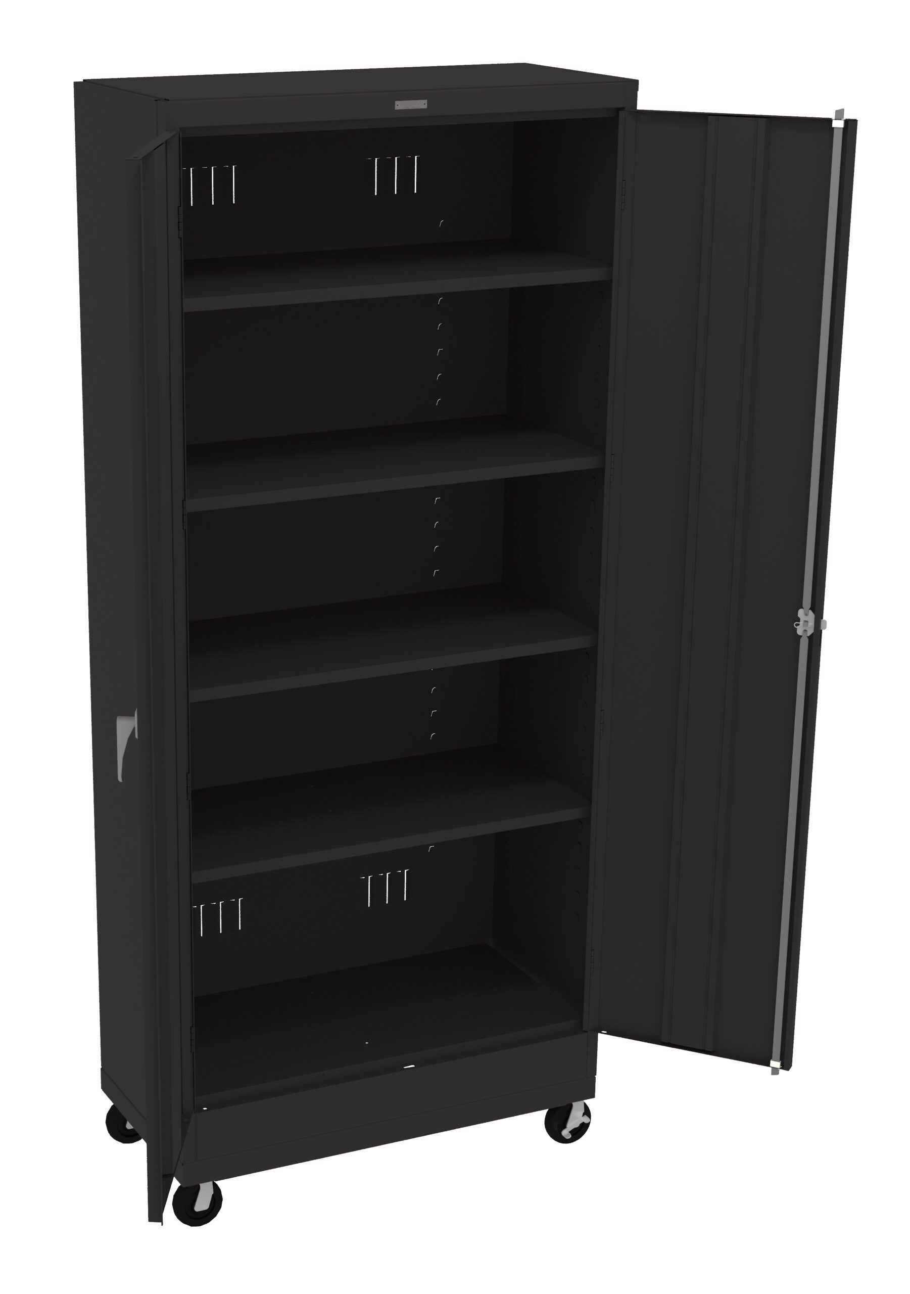 Casters provide mobility to your storage cabinet. 16-gauge fully welded frame and heavy duty construction provides superior sturdiness and increased strength over our standard cabinets. Doors incorporate an extra wide reinforcement that is welded for added strength and stability. Two adjustable levelers compensate for uneven floors. Two brushed chrome handles. Right handle uses three-point keyed locking to secure both doors. Four-knuckle hinges for added durability. Louvered back panel provides cabinet ventilation. Shelves adjust in 2″ increments without tools. Integrated shelf support tabs secure shelves tightly to cabinet without clips or added parts.