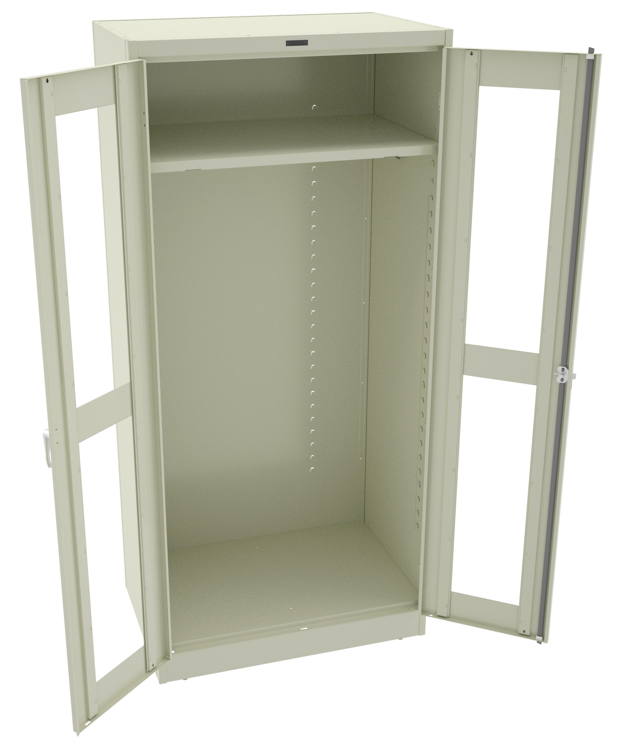 C-Thru doors provide the perfect solution for viewing contents of cabinets while restricting access. 16-gauge fully welded frame and heavy duty construction provides superior sturdiness and increased strength over our standard cabinets. Two adjustable levelers compensate for uneven floors. Two brushed chrome handles. Right handle uses three-point keyed locking to secure both doors. Four-knuckle hinges for added durability. Louvered back panel provides cabinet ventilation. Shelves adjust in 2″ increments without tools. Integrated shelf support tabs secure shelves tightly to cabinet without clips or added parts. Raised base keeps contents out of harm’s way from cleaning liquids.