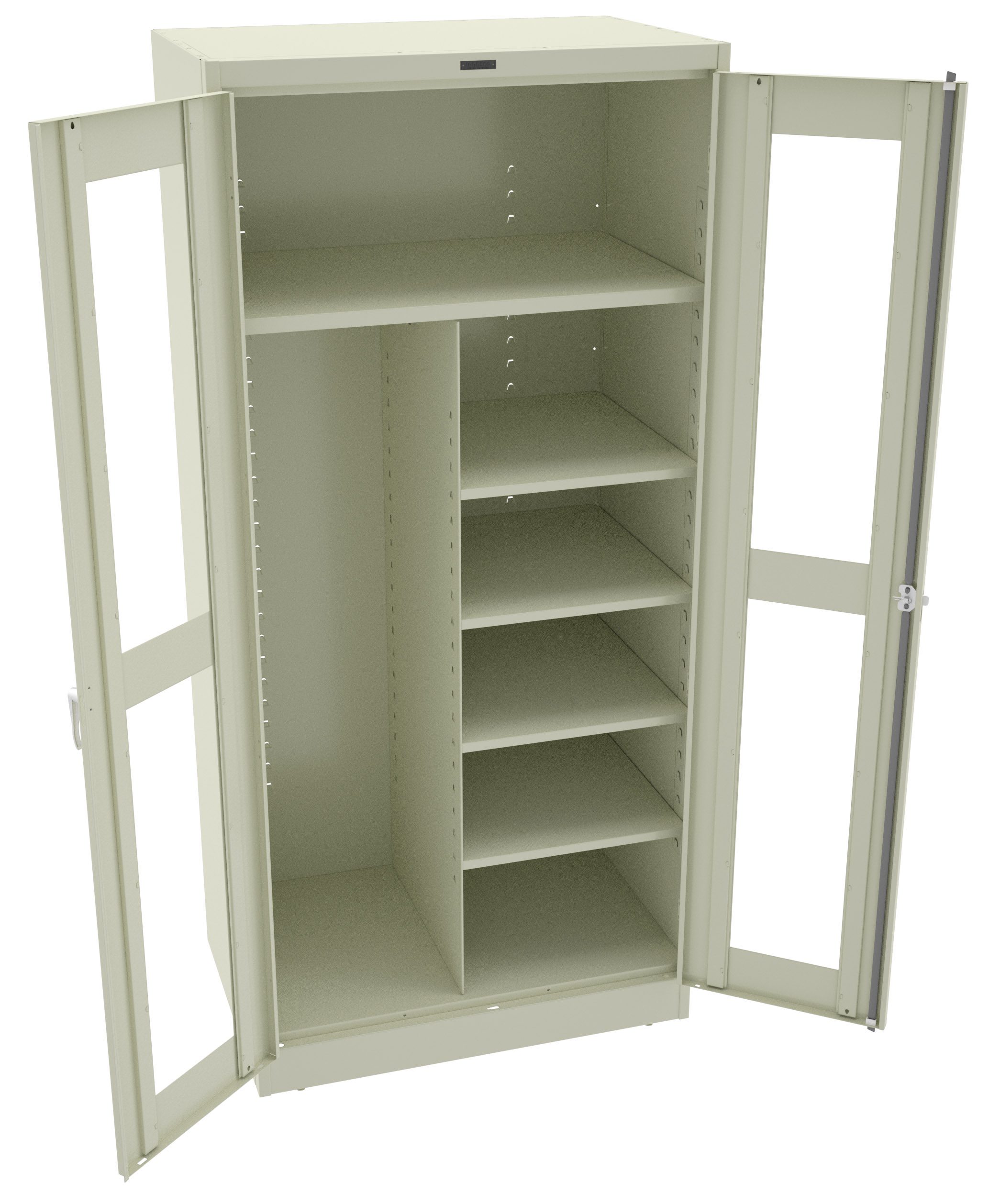 C-Thru doors provide the perfect solution for viewing contents of cabinets while restricting access. 16-gauge fully welded frame and heavy duty construction provides superior sturdiness and increased strength over our standard cabinets. Two adjustable levelers compensate for uneven floors. Two brushed chrome handles. Right handle uses three-point keyed locking to secure both doors. Four-knuckle hinges for added durability. Louvered back panel provides cabinet ventilation. Shelves adjust in 2″ increments without tools. Integrated shelf support tabs secure shelves tightly to cabinet without clips or added parts. Raised base keeps contents out of harm’s way from cleaning liquids.