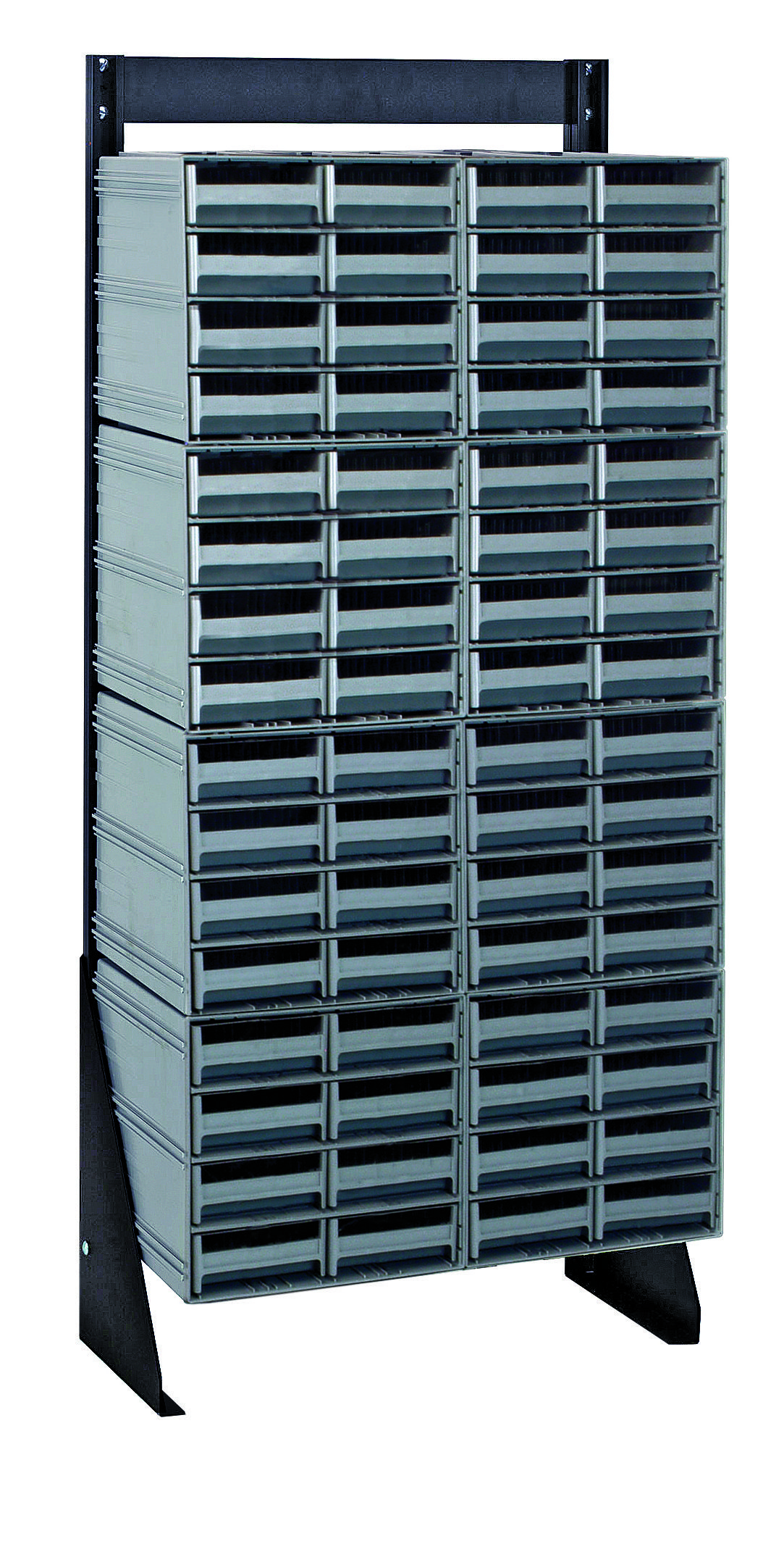 Interlocking Storage Cabinets Floor Stand, single sided, 12″D x 23-5/8″W x 52″H, 300 lbs. load capacity, includes: (8) QIC-83, (64) gray drawers, 14 gauge steel, black coated finish
