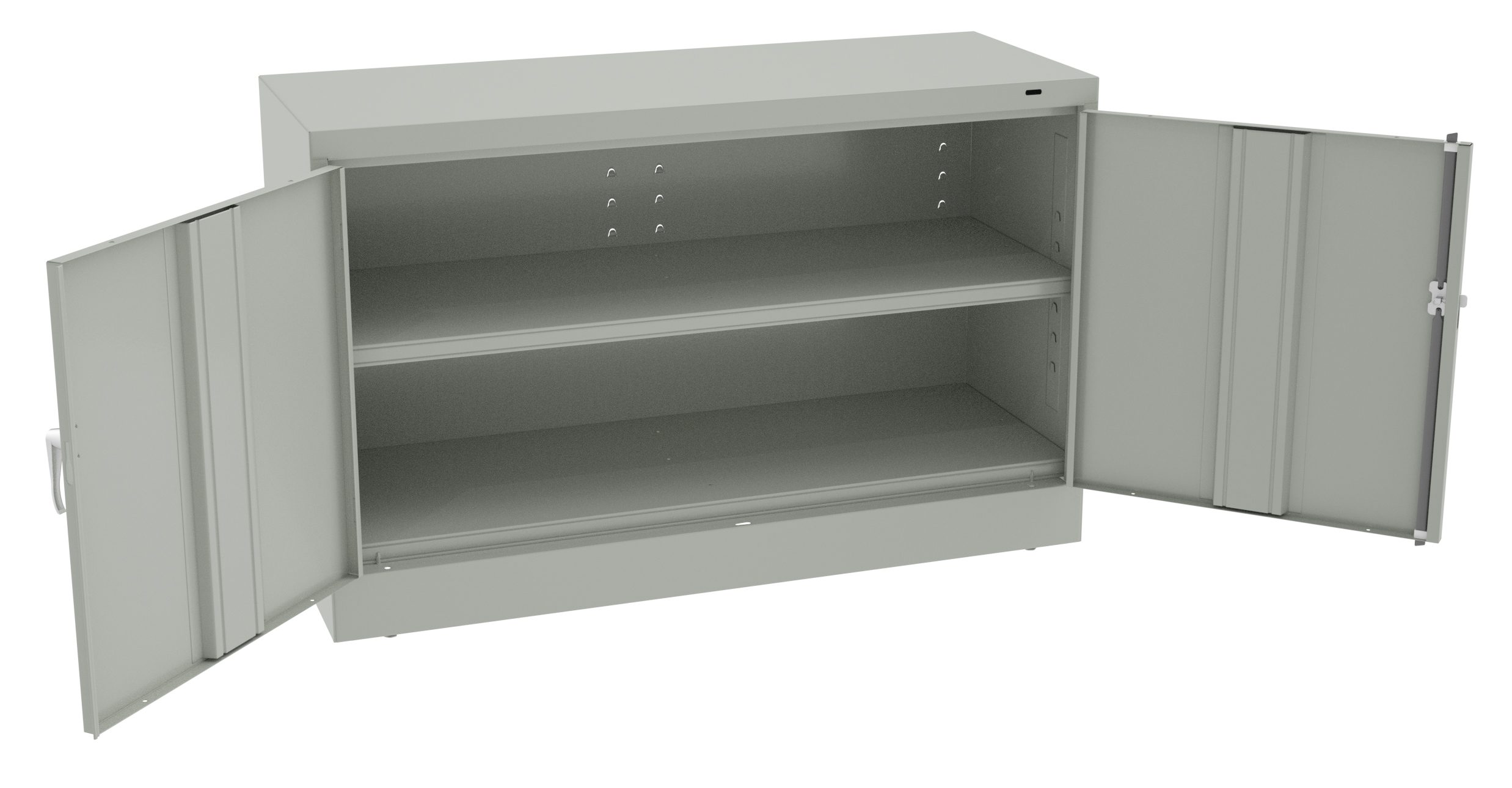 20-gauge doors and sides, 22-gauge backs along with a 18 gauge sill make these units sturdy enough to handle all your requirements. 48″ width provides 33% more storage. Our specially engineered shelves are spot welded in corners and along the length of the box form, enabling them to support up to 400 lbs. per shelf. Two adjustable levelers on front corners compensate for uneven floors. Two brushed chrome handles. Right handle uses three-point keyed locking to secure both doors. Shelves adjust in 2″ increments without tools. Integrated shelf support tabs secure shelves tightly to cabinet without clips or added parts. Raised base keeps contents out of harm’s way from cleaning liquids.