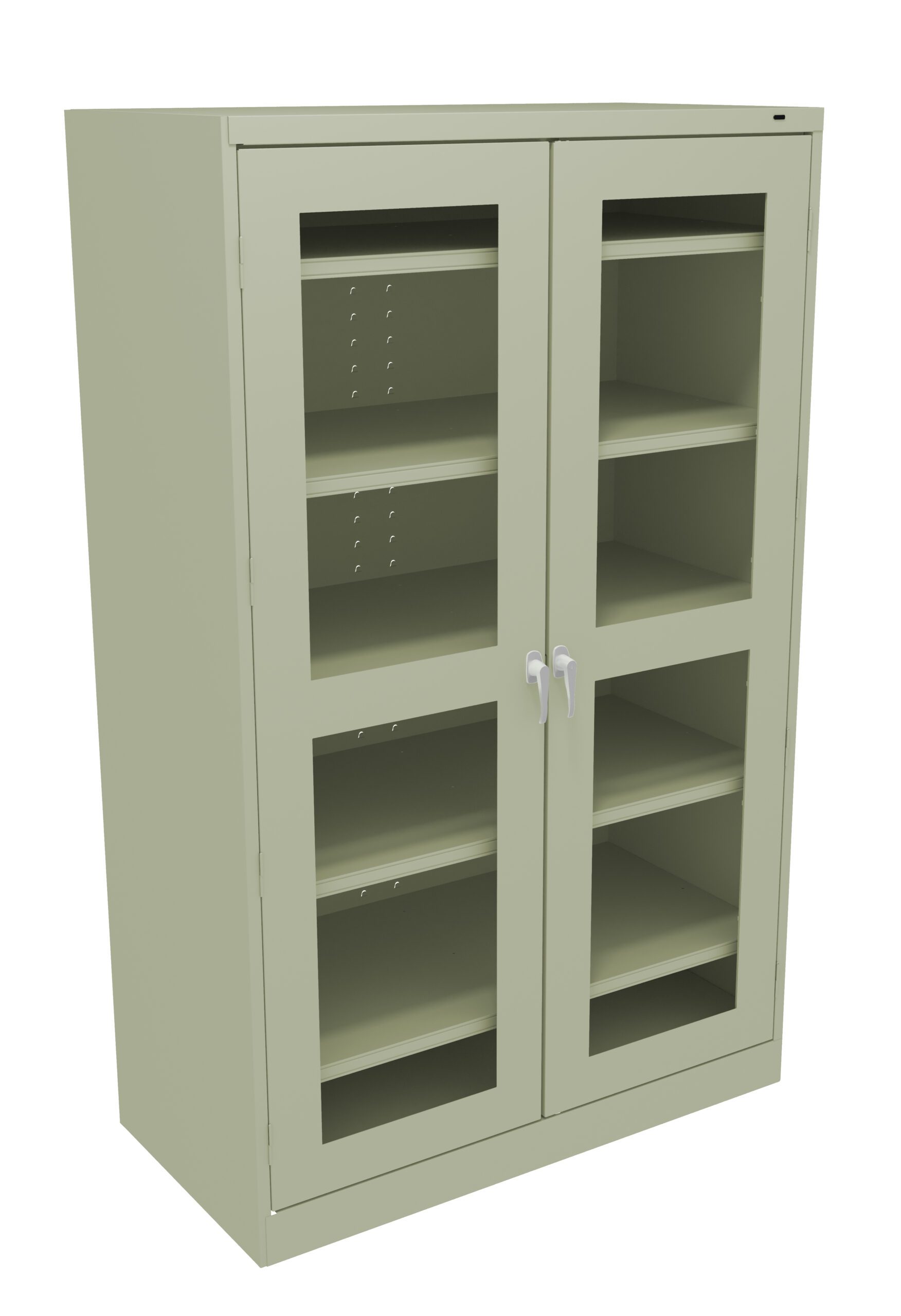 C-Thru doors provide the perfect solution for viewing contents of cabinets while restricting access. 48″ width provides 33% more storage. Our specially engineered shelves are spot welded in corners and along the length of the box form, enabling them to support up to 400 lbs. per shelf. Two adjustable levelers on front corners compensate for uneven floors. Two brushed chrome handles. Right handle uses three-point keyed locking to secure both doors. Shelves adjust in 2″ increments without tools. Integrated shelf support tabs secure shelves tightly to cabinet without clips or added parts. Raised base keeps contents out of harm’s way from cleaning liquids.