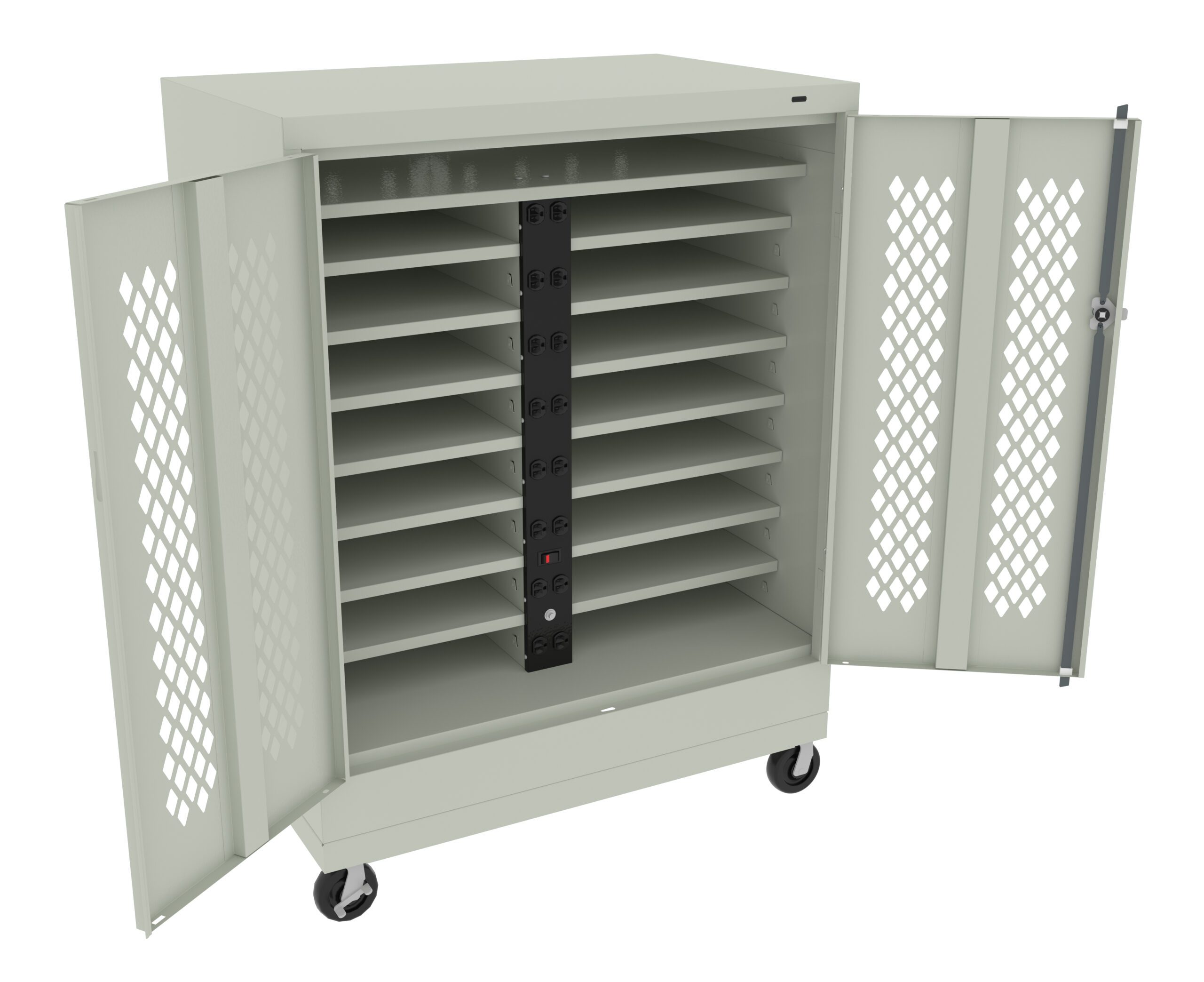 Electrical power strip features a power switch and a 15 amp circuit breaker with a reset button. 42″ high units have eight duplex outlets. Perforated doors allow heat to dissipate. One chrome handle on cabinet with three-point locking mechanism. Adjustable shelves allow for versatile storage options. Casters provide mobility to your storage cabinet. Fully welded construction.
