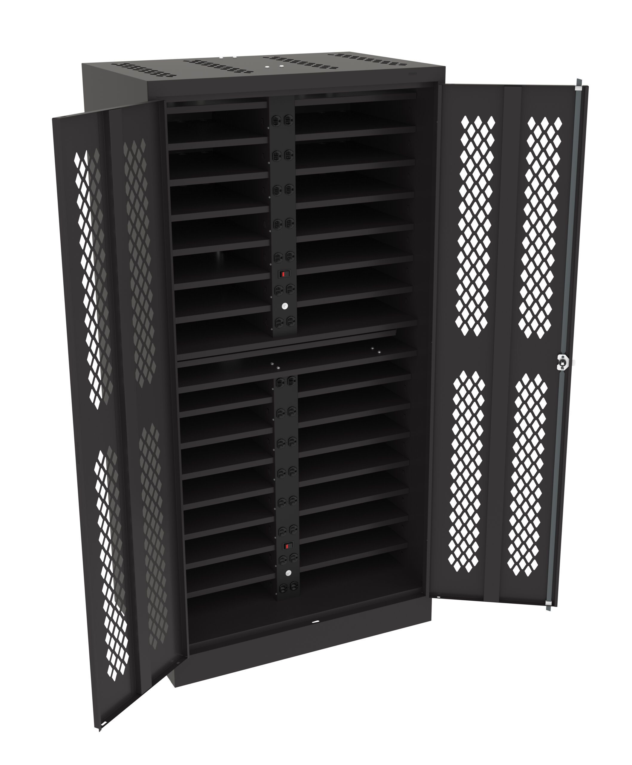 Electrical power strip features a power switch and a 15 amp circuit breaker with a reset button. 72″ high units have sixteen duplex outlets. Perforated doors allow heat to dissipate. One chrome handle on cabinet with three-point locking mechanism. Adjustable shelves allow for versatile storage options. Pull-out reference shelf provides an instant workspace. Fully welded construction.