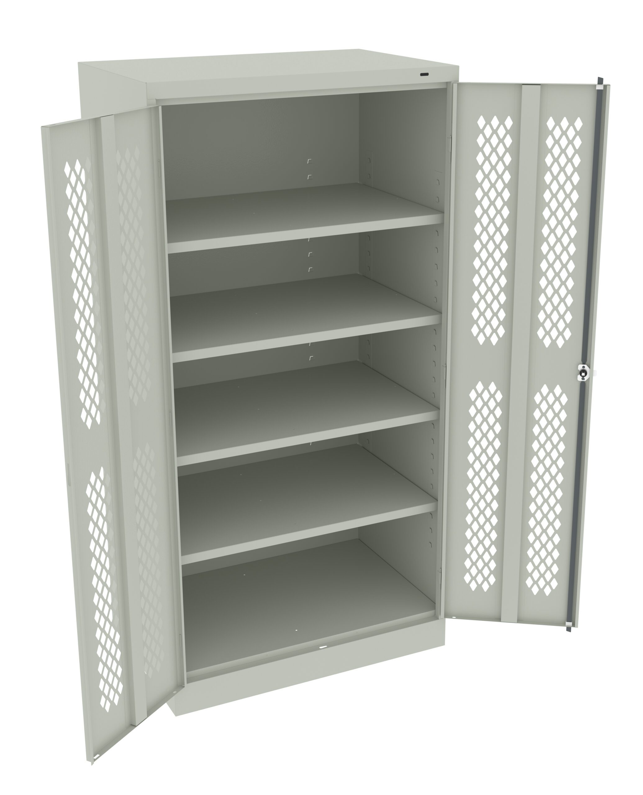 Perforated doors allow for items to have continual airflow. Standard cabinets are built with premium quality steel for long-term performance at an attractive price. Polished chrome handle uses three-point keyed locking to lock both doors. Punched lances in back facilitate ventilation. Shelves adjust in 2″ increments without tools. Integrated shelf support tabs secure shelves tightly to cabinet without clips or added parts. Raised base keeps contents out of harm’s way from cleaning liquids.