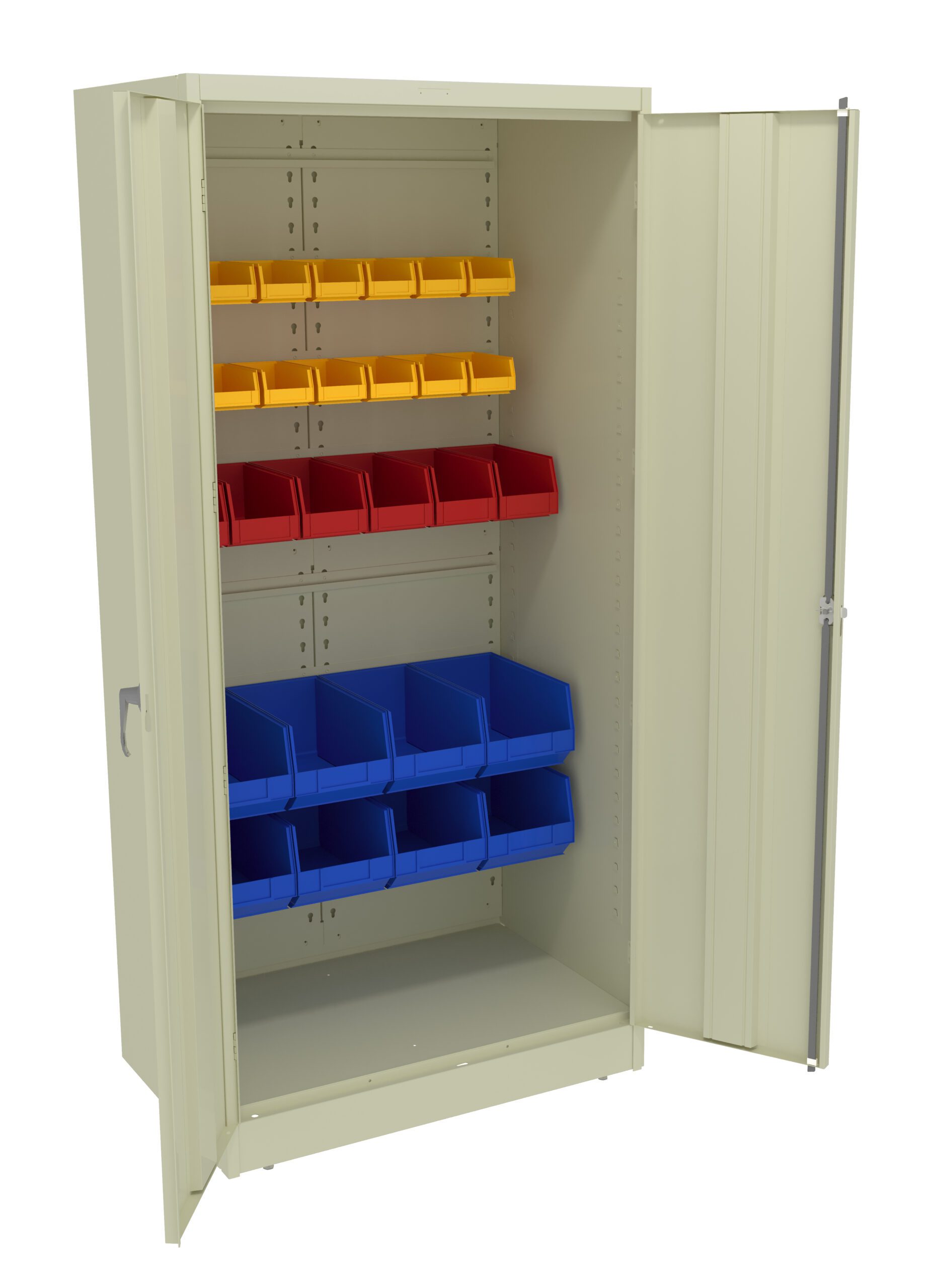 Adjustable bin rails adjust on 2” centers, providing flexibility to store a variety of bin heights. Snap-in rivet design allows bin rails to be connected without tools. Fully welded construction. Two chrome handles on cabinet with three-point keyed locking mechanism.