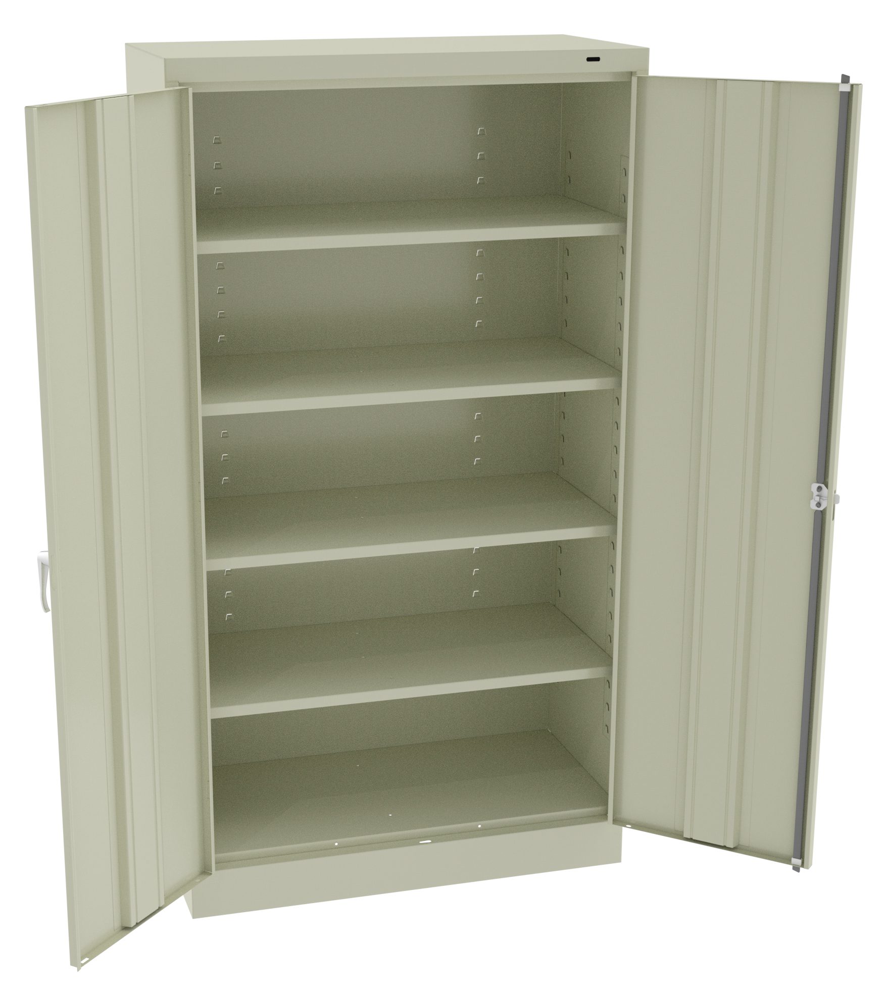 Standard cabinets are built with premium quality steel and reinforced doors for long-term performance at an attractive price. Two brushed chrome handles. Right handle uses three-point keyed locking to secure both doors. Punched lances in back facilitate ventilation. Shelves adjust in 2″ increments without tools. Integrated shelf support tabs secure shelves tightly to cabinet without clips or added parts. Raised base keeps contents out of harm’s way from cleaning liquids.